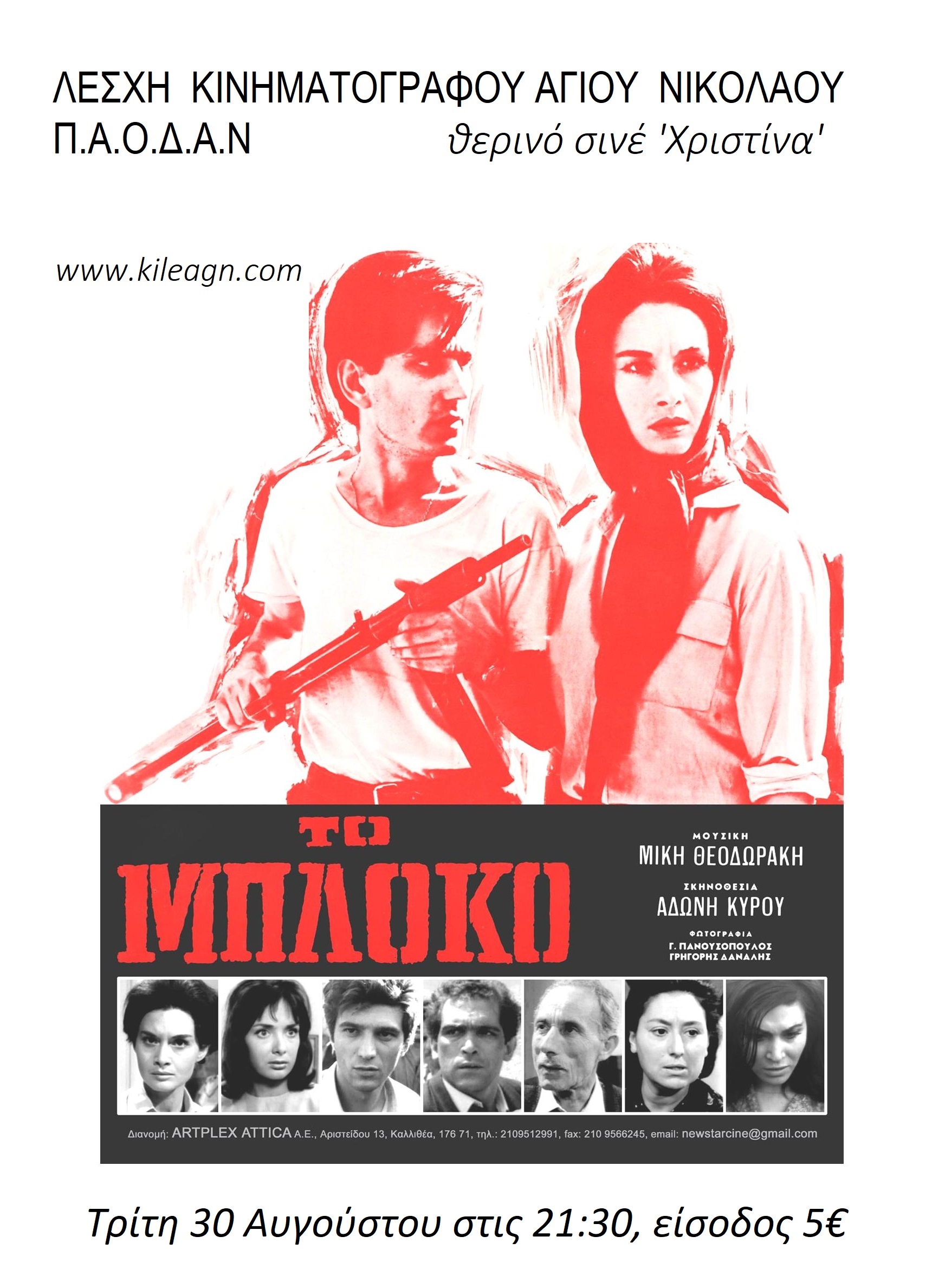 Οι καλοκαιρινές προβολές που διοργανώνει η Λέσχη Κινηματογράφου Αγίου Νικολάου σε συνεργασία με τον Π.Α.Ο.Δ.Α.Ν. συνεχίζονται με την ιστορική ταινία ‘Το Mπλόκο’.