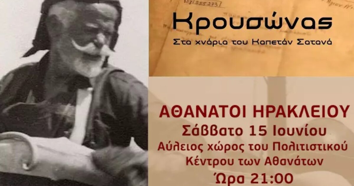 Το Σάββατο 15 Ιουνίου και ώρα 9μμ ο Πολιτιστικός Σύλλογος Αθανάτων τιμώντας την 83η επέτειο της Μάχης της Κρήτης θα προβάλει στην αυλή του Πολιτιστικού Κέντρου στους Αθανάτους το ντοκιμαντέρ της κας Βίκης Αρβελάκη για τον καπετάν Αντώνη Γρηγοράκη, γνωστό ως «Σατανά».