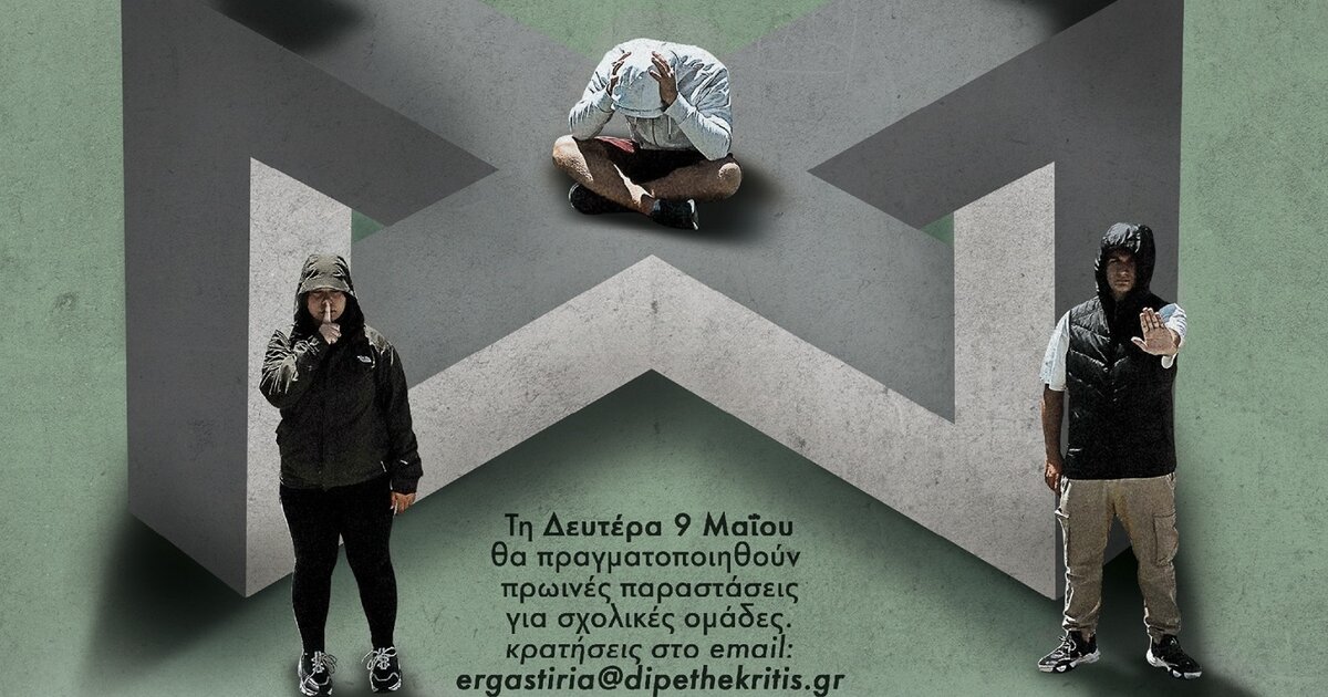 Οι παραστάσεις αυτή την ημερομηνία θα πραγματοποιηθούν πρωινές ώρες για σχολικές ομάδες (10:00 Μια δοκιμασία που τη λένε.. εφηβεία, Γυμνάσιο Αλικιανού | 11:00 Η τριλογία της τοξίνης, 2ο ΕΠΑΛ Χανίων | 12:00 Square one, Λύκειο Νέας Κυδωνίας | 13:00 Φτου κι εξιά, ΕΠΑΛ Ακρωτηρίου).