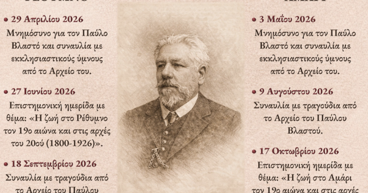Με την ευκαιρία της συμπλήρωσης 100 χρόνων από τον θάνατο του Πατέρα της Κρητικής Λαογραφίας, Παύλου Βλαστού(1926–2026), η Χορωδία και Ορχήστρα Παραδοσιακής Μουσικής «Παύλος Βλαστός» συν-διοργανώνει με την Ιερά Μητρόπολη Ρεθύμνης και Αυλοποτάμου, με την Περιφέρεια Κρήτης, τον Δήμο Ρεθύμνου και την Ιστορική Λαογραφική εταιρία Ρεθύμνου, επιστημονική ημερίδα στο Ρέθυμνο το Σάββατο 27 Ιουνίου 2026 στο κέντρο κοινωνικής και πολιτιστικής διακονίας « Θεομήτωρ»