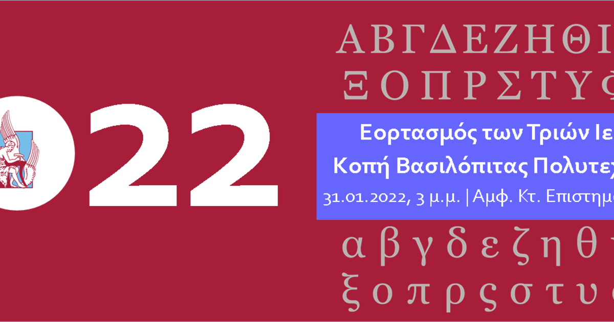 Η Πρυτανεία του Πολυτεχνείου Κρήτης διοργανώνει εκδήλωση για τον Εορτασμό των Τριών Ιεραρχών, της επίσημης ημέρας των γραμμάτων και της παιδείας, και για την ετήσια Κοπή της Βασιλόπιτας του Ιδρύματος. Η εκδήλωση θα πραγματοποιηθεί τη Δευτέρα 31 Ιανουαρίου 2022 και ώρα 3:00 μ.μ.