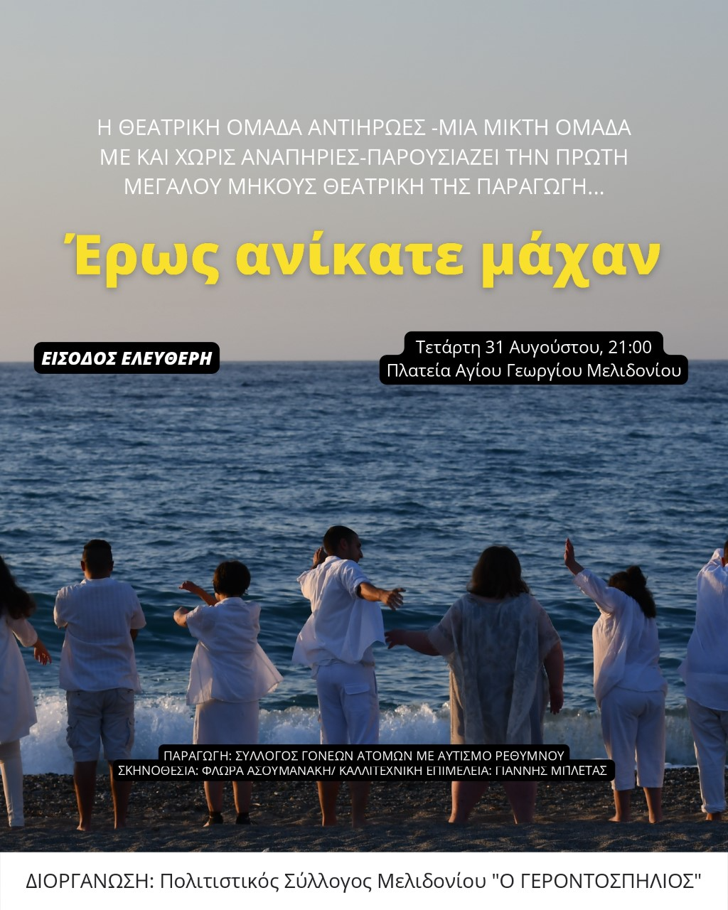 Ο Πολιτιστικός σύλλογος Μελιδονίου σας προσκαλεί με μεγάλη του χαρά σε μία ακόμα παράσταση με τίτλο "ΈΡΩΣ ΑΝΊΚΑΤΕ ΜΆΧΑΝ" από τη θεατρική ομάδα ΑμεΑ ΑΝΤΙΗΡΩΕΣ από το Ρέθυμνο.