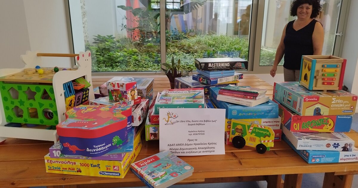 Το Κέντρο Δημιουργικής Απασχόλησης για παιδιά και ενήλικες με αναπηρία που στεγάζεται στη λεωφόρο Αρχιεπισκόπου Μακαρίου, αποτελεί μία πολύ σημαντική δομή για το Ηράκλειο, πληροί όλες τις προδιαγραφές και προσφέρει πραγματική ανακούφιση στα παιδιά και στους ενήλικες με αναπηρία, αλλά και στις οικογένειές τους. Το πρωί καλύπτει τις ανάγκες των ενηλίκων και το απόγευμα φιλοξενεί παιδιά. Σκοπός του Κ.Δ.Α.Π.Α.μεΑ. είναι η δημιουργική απασχόληση, η κοινωνική ένταξη, η βελτίωση ποιότητας ζωής, καθώς και η στήριξη οικογενειών. Σας ευχαριστούμε θερμά για την παράδοση εκπαιδευτικών βιβλίων και παζλς, μέσα από τα οποία οι ωφελουμενοι θα αναπτύξουν τις δεξιότητες των περαιτέρω". Τα παραπάνω μαζί με τις ευχαριστίες της αντιδημάρχου κοινωνικής πολιτικής Κας Ρένας Παπαδάκη Σκαλίδη καθώς και του προσωπικού του κέντρου, για τη δωρεά παιχνιδιών δημιουργικής απασχόλησης και εκπαίδευσης, της εθελοντικής ομάδας Inlibrovita. Η δωρεά έρχεται να καλύψει εκπαιδευτικές ανάγκες του κέντρου και πραγματοποιήθηκε σε συνεργασία με την εθελοντική ομάδα Give, η οποία διέθεσε μέρος των παιχνιδιών
