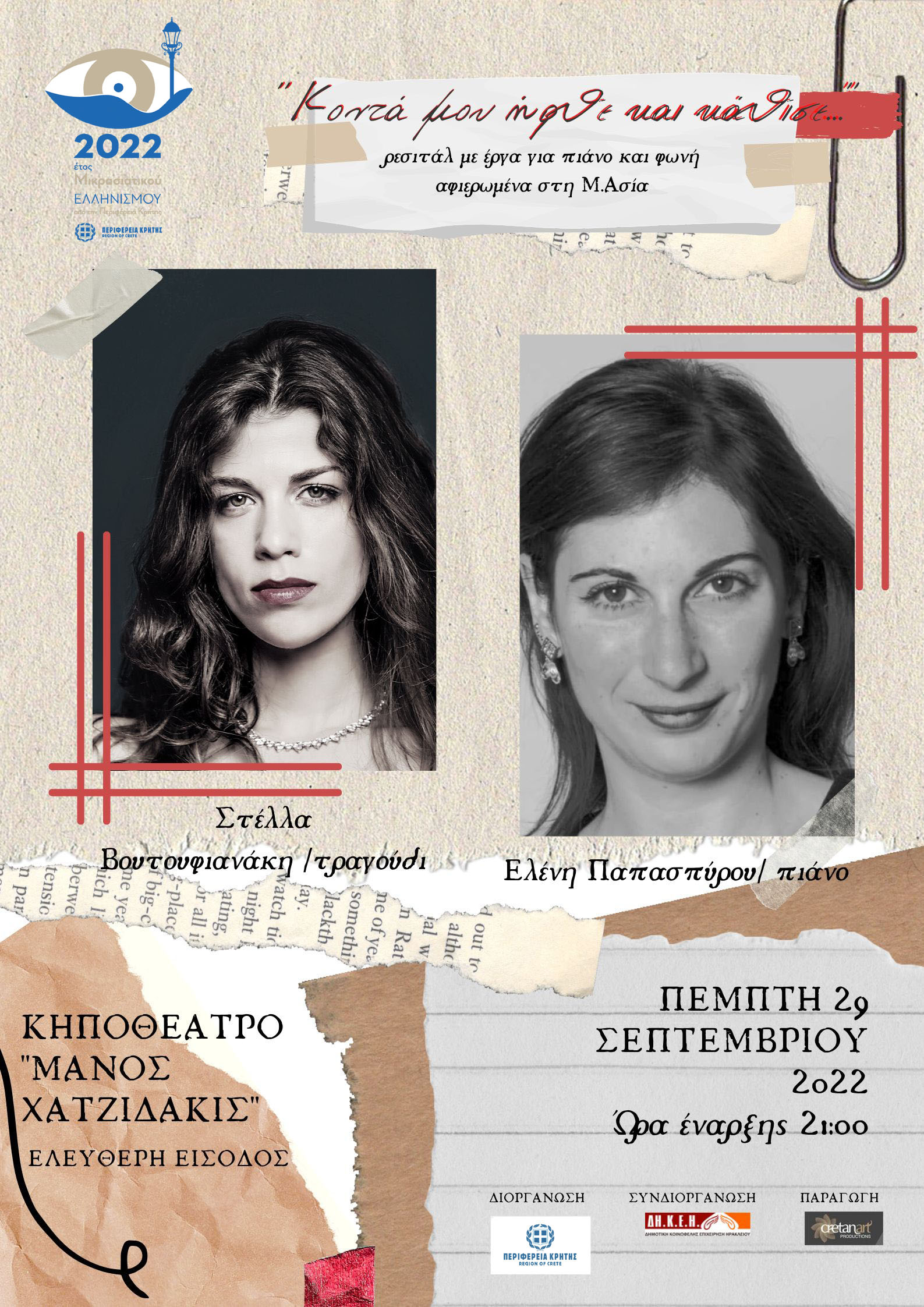 Η Περιφέρεια Κρήτης σε συνεργασία με το Δήμο Ηρακλείου, με αφορμή το έτος μνήμης για τα 100 χρόνια από την Μικρασιατική καταστροφή (1922-2022) διοργανώνουν στο ΚΗΠΟΘΕΑΤΡΟ «Μ.ΧΑΤΖΙΔΑΚΙΣ» την ΠΕΜΠΤΗ 29 ΣΕΠΤΕΜΒΡΙΟΥ 2022 το ρεσιτάλ
