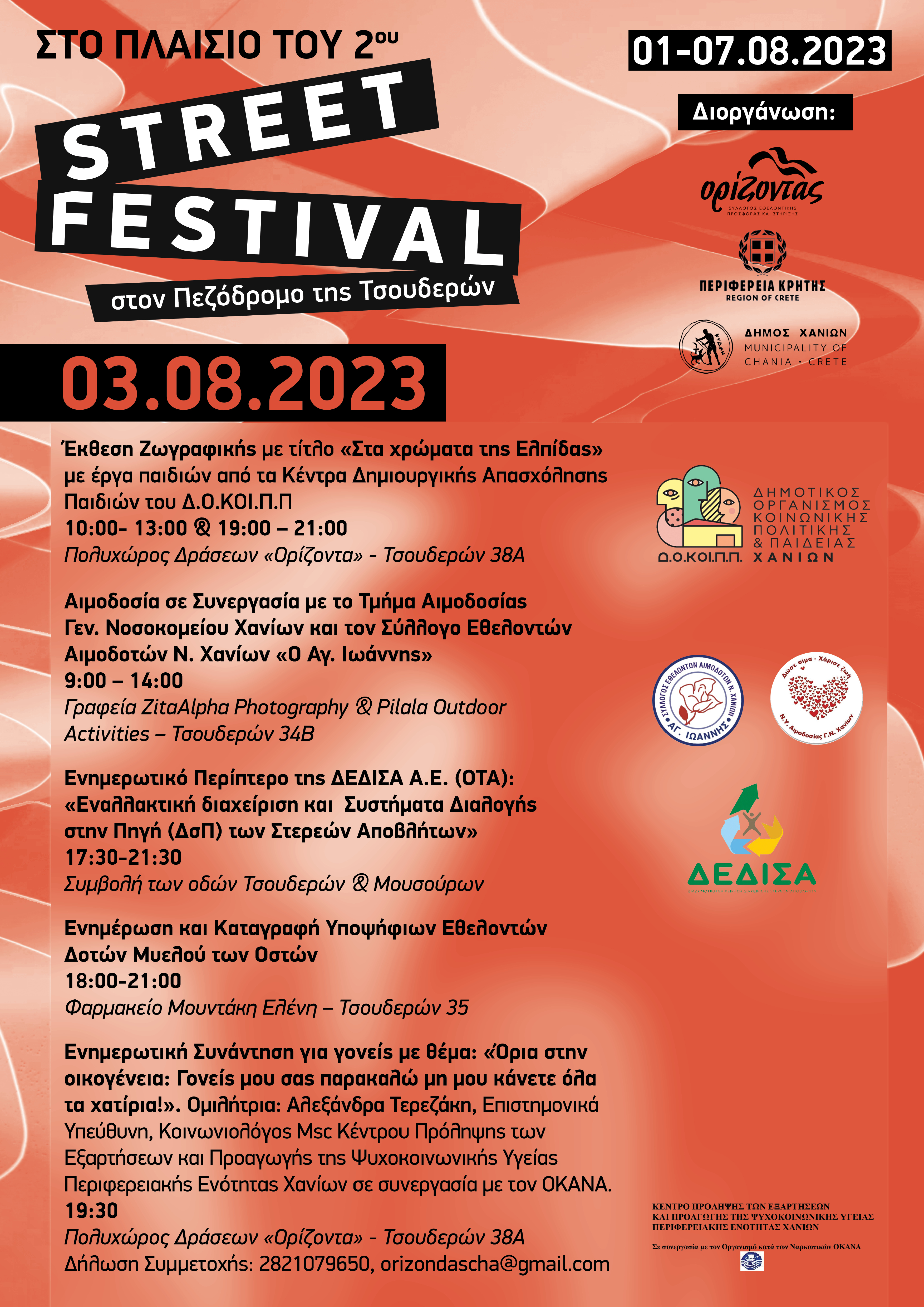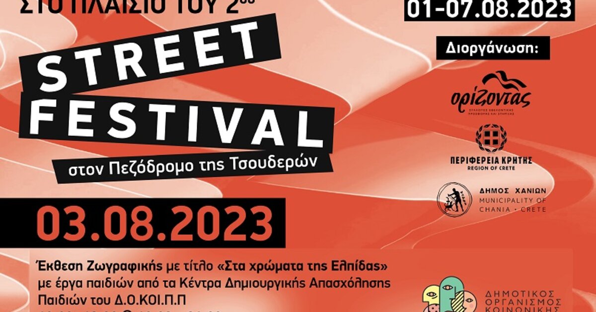 Ο Σύλλογος «Ορίζοντας», με το Τμήμα Κοινωνικής Πολιτικής του Δήμου Χανίων και την Περιφερειακή Ενότητα Χανίων – Περιφέρεια Κρήτης, διοργανώνουν για δεύτερη χρονιά το Street Festival στον Πεζόδρομο της Τσουδερών, από 1 έως 7 Αυγούστου, με σκοπό την προώθηση του εθελοντισμού μέσα από κοινωνικές και πολιτιστικές εκδηλώσεις.