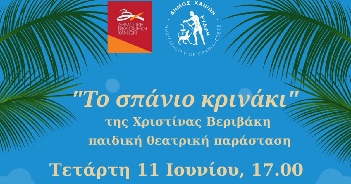 Η Δημοτική Βιβλιοθήκη Χανίων προσκαλεί παιδιά και γονείς στον φιλόξενο χώρο του Κέντρου Παιδικής Δημιουργίας Αγ. Ιωάννη, του Τμήματος Βιβλιοθηκών Δήμου Χανίων, στην παιδική θεατρική παράσταση με τίτλο: Το σπάνιο κρινάκι, της Χριστίνας Βεριβάκη.