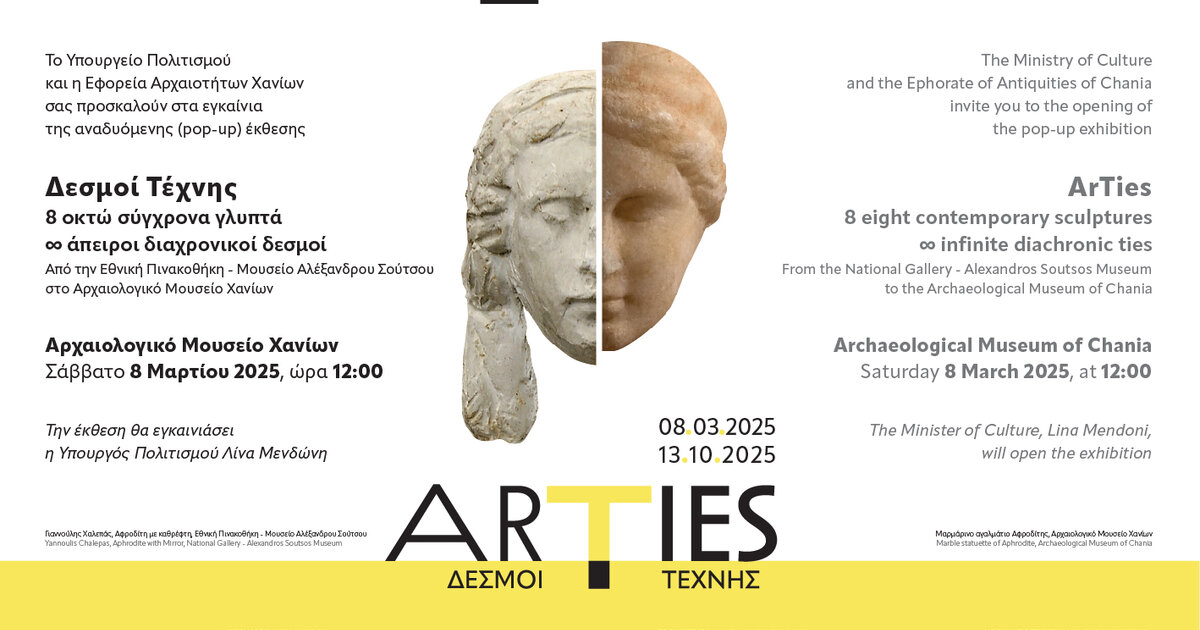 Το Αρχαιολογικό Μουσείο Χανίων υποδέχεται την Εθνική Πινακοθήκη - Μουσείο Αλέξανδρου Σούτσου στο πλαίσιο της αναδυόμενης (pop-up) έκθεσης με τίτλο Δεσμοί Τέχνης: 8 οκτώ σύγχρονα γλυπτά – ∞ άπειροι διαχρονικοί δεσμοί, η οποία διοργανώνεται από το Υπουργείο Πολιτισμού και την Εφορεία Αρχαιοτήτων Χανίων.