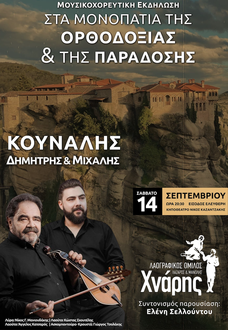 Ο Ιεραποστολικός και Φιλανθρωπικός Σύλλογος «Δράσις Αγάπης» και η Περιφέρεια Κρήτης διοργανώνουν τη μουσικοχορευτική εκδήλωση: «Στα μονοπάτια της ορθοδοξίας και της παράδοσης 2024» με ελεύθερη είσοδο.