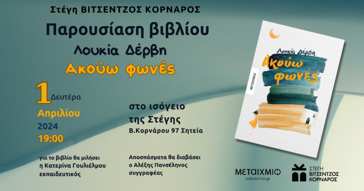 Η Στέγη ΒΙΤΣΕΝΤΖΟΣ ΚΟΡΝΑΡΟΣ διοργανώνει εκδήλωση για την παρουσίαση του βιβλίου της Λουκίας Δέρβη «Ακούω φωνές». Η εκδήλωση θα πραγματοποιηθεί την ερχόμενη Δευτέρα 1η Απριλίου στις 19:00 στο ισόγειο της Στέγης στη Σητεία.