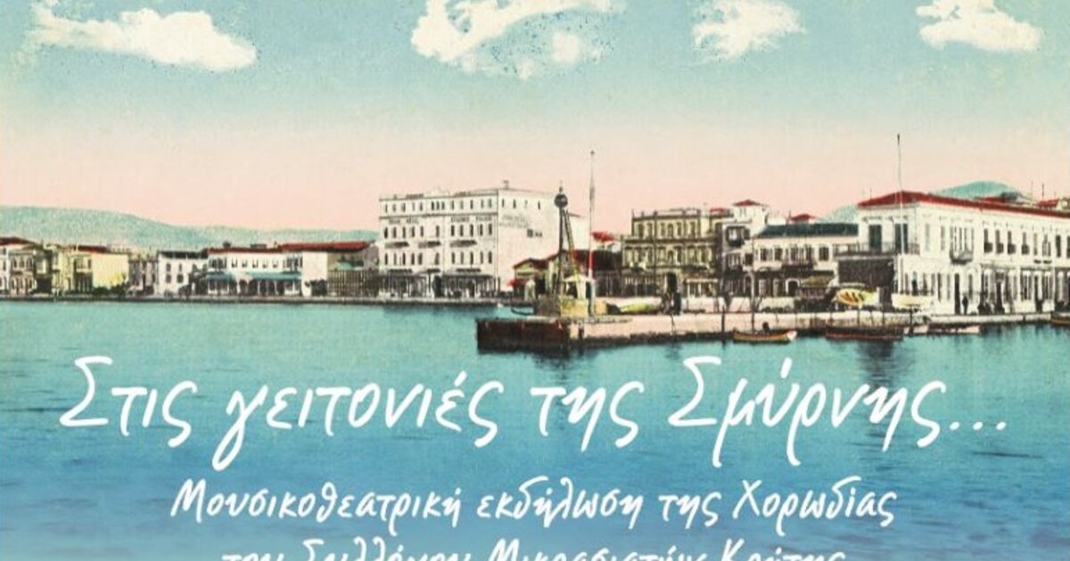 Ο Σύλλογος Μικρασιατών Κρήτης «Ο Αγ. Πολύκαρπος και η Χορωδία του Συλλόγου την Παρασκευή 13 Σεπτεμβρίου 2024 ώρα 21:00 στο Κηποθέατρο Ν. Καζαντζάκης, παρουσιάζει με τη στήριξη της Περιφέρειας Κρήτης και δωρεάν είσοδο την μουσικοθεατρική παράσταση με τίτλο:«Στις γειτονιές της Σμύρνης…»