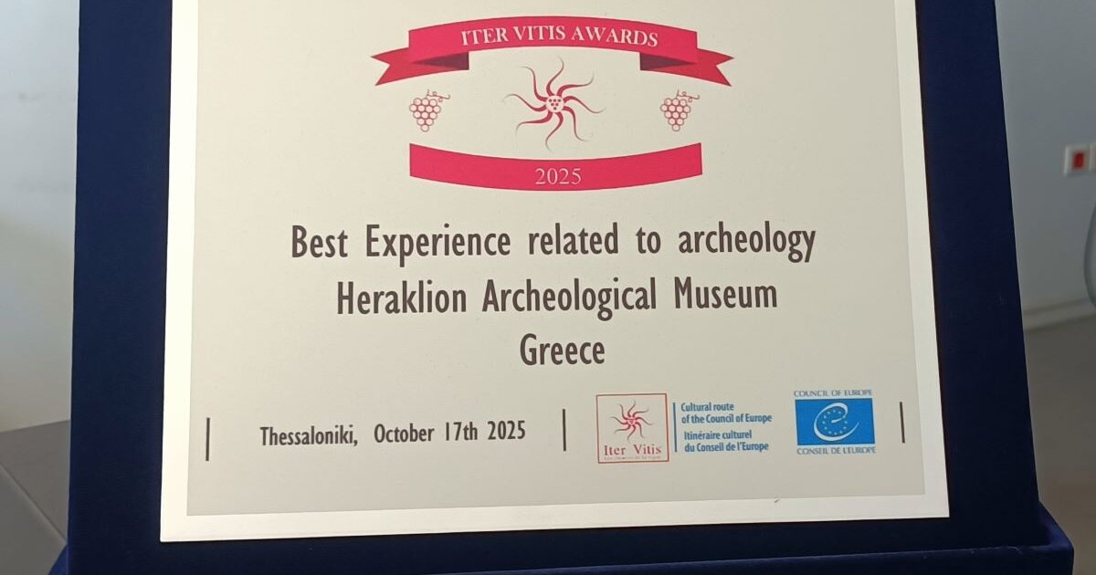 Mε το βραβείο «Καλύτερη Πρακτική στον τομέα της αρχαιολογίας (Best Experience in Archaeology)» τιμήθηκε το Αρχαιολογικό Μουσείο Ηρακλείου στα 9α Βραβεία Iter Vitis, η τελετή απονομής των οποίων έγινε στις 17 Οκτωβρίου 2025, στη Θεσσαλονίκη. Συγκεκριμένα, το Μουσείο τιμήθηκε για τη διαμόρφωση μιας θεματικής διαδρομής Iter Vitis στη μόνιμη έκθεσή του, επιλέγοντας από το πλήθος των εξαιρετικών εκθεμάτων εκείνα που αφηγούνται τη συναρπαστική ιστορία του οίνου, όπως βιώθηκε σε ώρες επίσημες της κοινωνικής ζωής, σε στιγμές μυστικιστικές της λατρείας των θεοτήτων αλλά και σε καθημερινές του μόχθου και της ανάπαυλας. Με την έκδοση ενός πολυτελούς οδηγού της διαδρομής, το Μουσείο επιθυμεί να αναδείξει την καλλιέργεια και χρήση της αμπέλου στην αρχαιότητα αλλά και την αξία του σταφυλιού, της σταφίδας και κυρίως του κρητικού οίνου διαχρονικά.