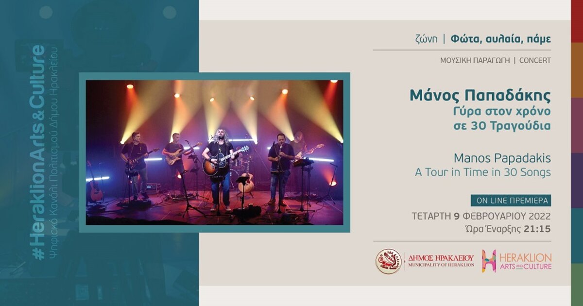 Μια μουσική "Γύρα στον χρόνο σε 30 Τραγούδια" με τον Μάνο Παπαδάκη, έρχεται την Tετάρτη 9 Φεβρουαρίου 2022 στις 21:15 στο διαδικτυακό κανάλι πολιτισμού του Δήμου Ηρακλείου - Heraklion Arts and Culture!