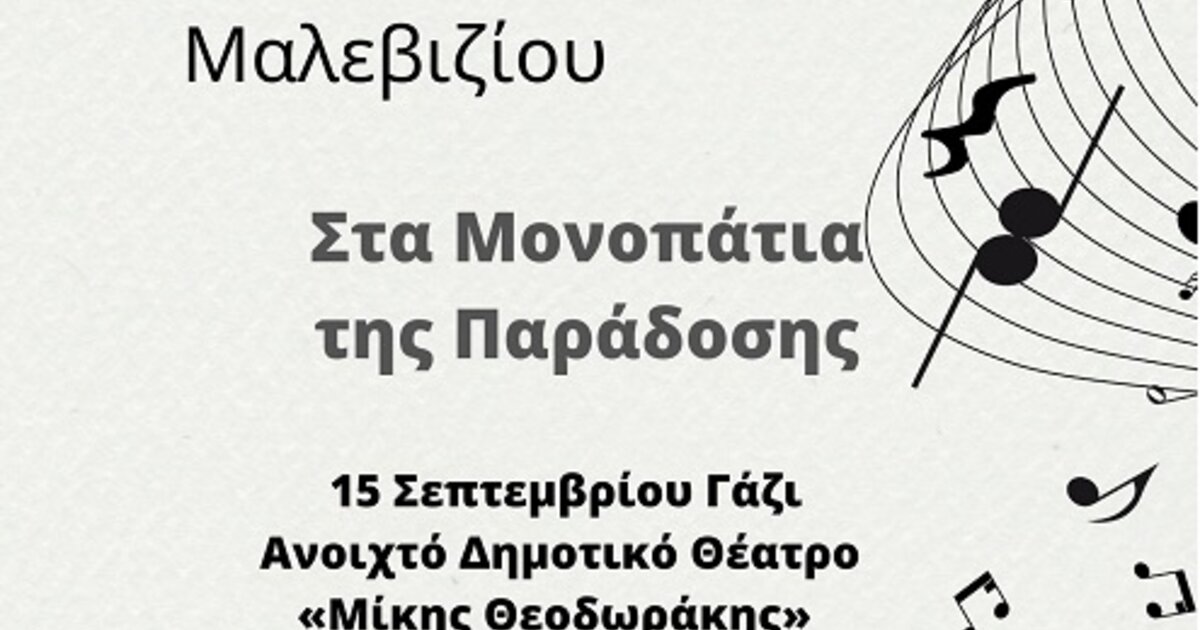 Στο Γάζι, στο Ανοιχτό Δημοτικό Θέατρο "Μίκης Θεοδωράκης", η Χορωδία του Δήμου Μαλεβιζίου θα παρουσιάσει τη μουσική παράσταση «Μονοπάτια της Παράδοσης», σήμερα στις 20.30.