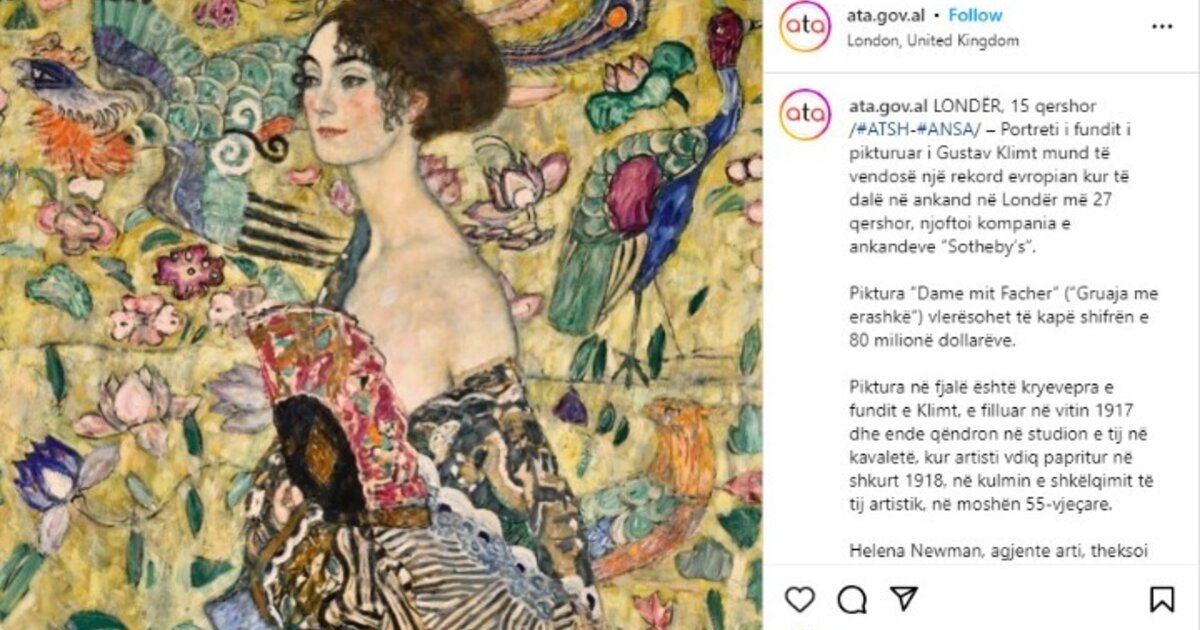 Το εντυπωσιακό ποσό των 80 εκατομμυρίων δολαρίων είναι η εκτίμηση για τη δημοπράτηση στις 27 Ιουνίου στου Sotheby's στο Λονδίνο του πίνακα «Dame mit Fächer (Κυρία με Βεντάλια)» του Γκούσταφ Κλιμτ. Το έργο, το τελευταίο πορτρέτο που ζωγράφισε ο Κλιμτ προς το τέλος της ζωής του το 1918, προβάλλεται από την Helena Newman, πρόεδρο του Sotheby's Europe και επικεφαλής του τομέα ιμπρεσιονιστικής και μοντέρνας τέχνης στον οίκο δημοπρασιών, ως «ένα από τα πλέον εξαιρετικά έργα του, ζωγραφισμένο όταν ήταν ακόμα στα καλύτερα χρόνια της καλλιτεχνικής δημιουργίας του».