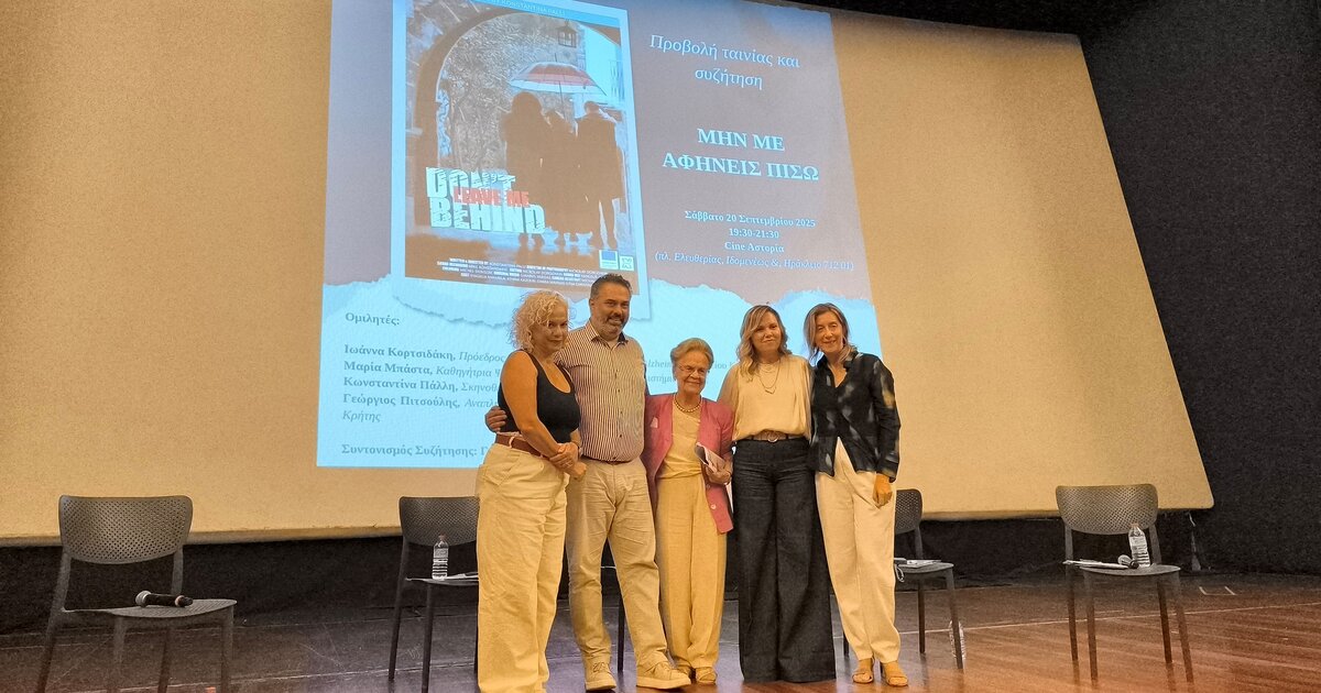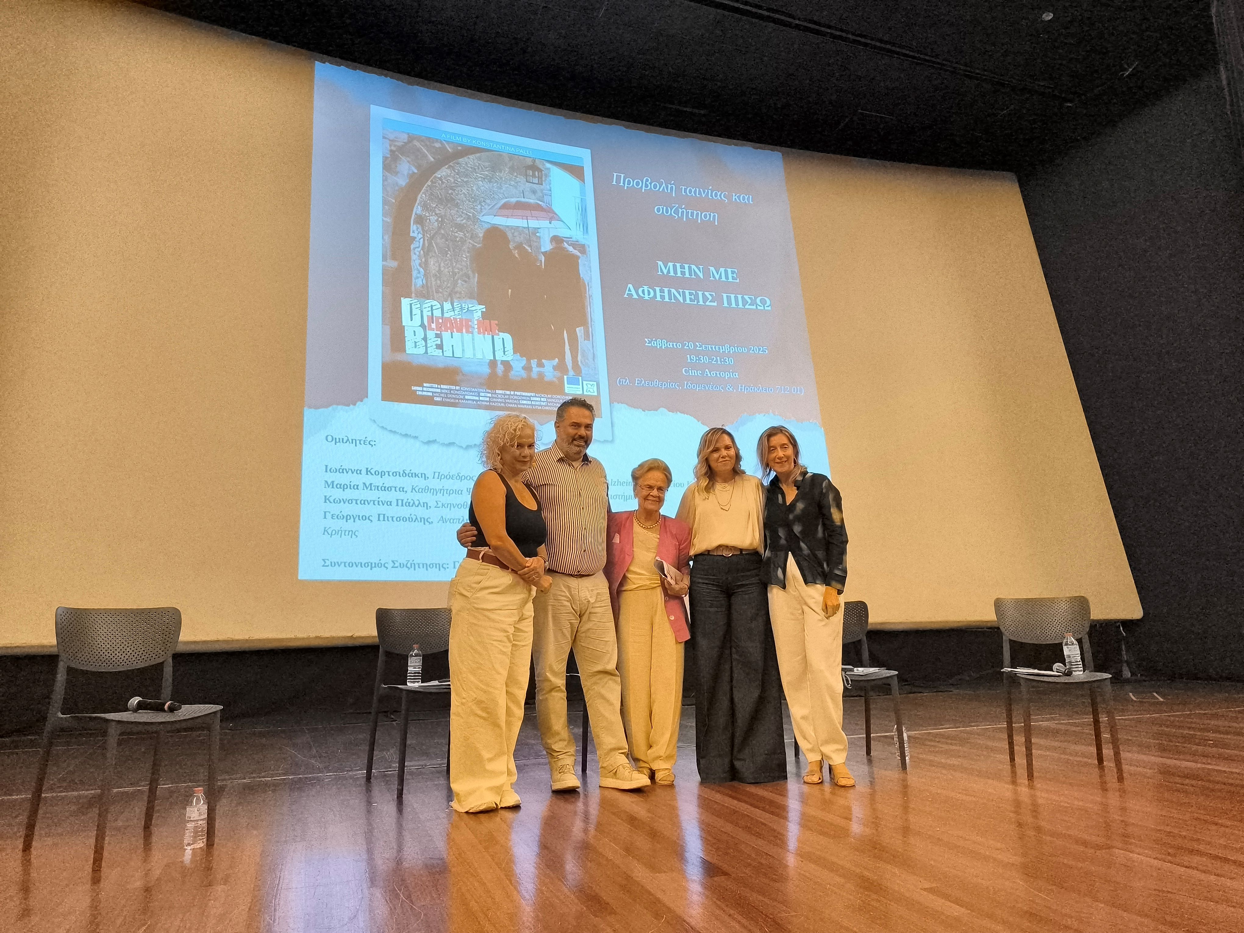 Το Σάββατο 20 Σεπτεμβρίου, ο Κινηματογράφος Αστόρια στο Ηράκλειο γέμισε από κόσμο που προσήλθε με ενδιαφέρον και ευαισθησία για να παρακολουθήσει την πρεμιέρα της ταινίας μικρού μήκους «Μην με αφήνεις πίσω – Don’t Leave Me Behind» της Κωνσταντίνας Πάλλη. Η εκδήλωση πραγματοποιήθηκε στο πλαίσιο της Παγκόσμιας Ημέρας για τη Νόσο Alzheimer (21 Σεπτεμβρίου) και συνδιοργανώθηκε από το Europe Direct της Περιφέρειας Κρήτης και την εταιρεία Studio Rosso.