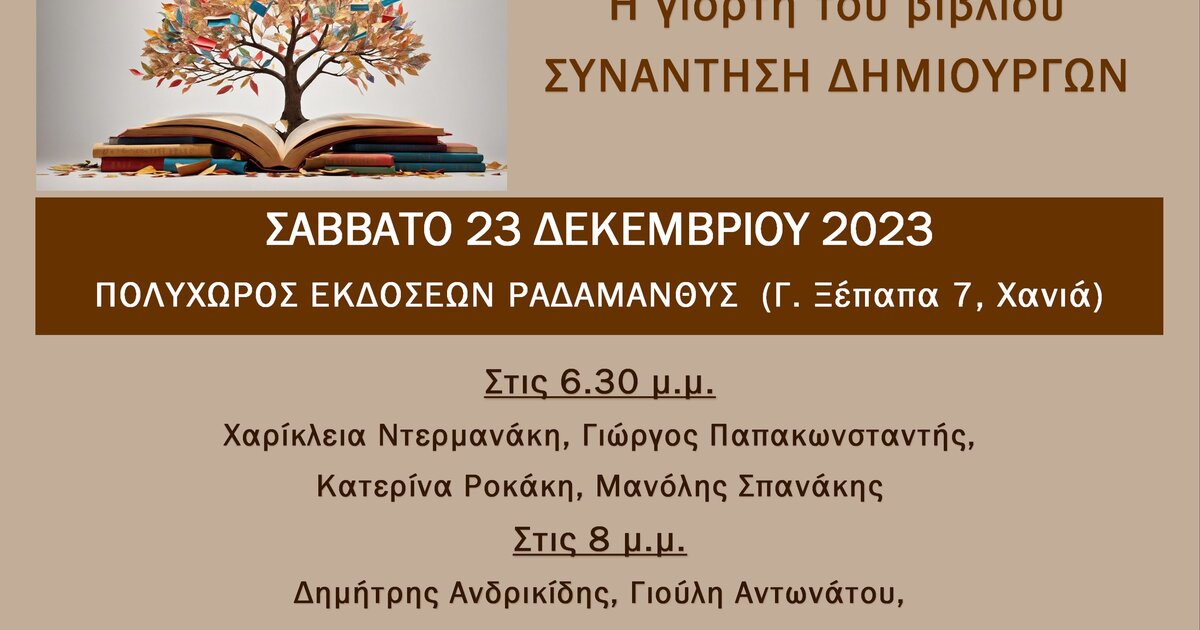 Η γιορτή του βιβλίου συνεχίζεται στον πολυχώρο των Εκδόσεων Ραδάμανθυς, στα Χανιά. Περισσότεροι από πενήντα λογοτέχνες και ποιητές ανταμώνουν και συζητούν για τα έργα τους, παρουσιάζουν τη δουλειά τους και διαβάζουν αποσπάσματα από τα βιβλία τους. Σε κάθε εκδήλωση υπάρχει έκθεση των Εκδόσεων Ραδάμανθυς, με μεγάλες προσφορές για τους αναγνώστες.