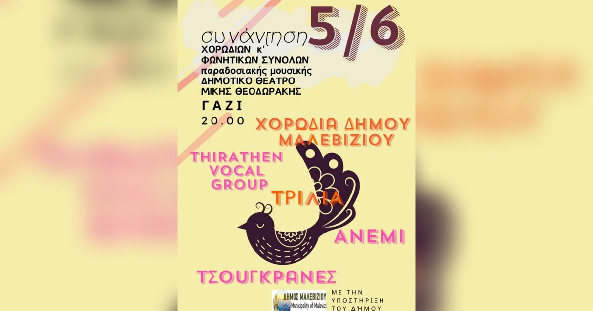 Την Τετάρτη 5 Ιουνίου στο ανοιχτό Δημοτικό Θέατρο Μαλεβιζίου «Μίκης Θεοδωράκης» στο Γάζι, θα πραγματοποιηθεί για πρώτη φορά συνάντηση χορωδιών και φωνητικών συνόλων που δραστηριοποιούνται στο Ηράκλειο και στον Δήμο Μαλεβιζίου.