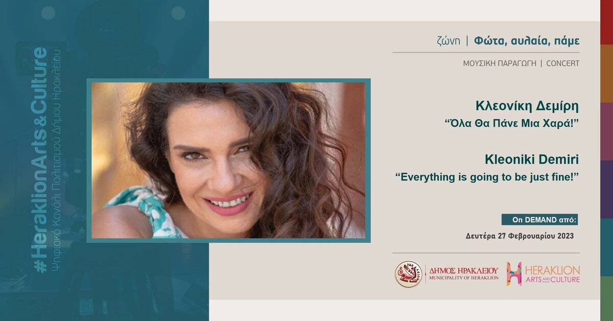 Η συναυλία της Κλεονίκης Δεμίρη με τίτλο «Όλα θα πάνε μια χάρα» που παρουσιάστηκε στην Δημοτική Ακτή Καρτερού, στo πλαίσιo του Φεστιβάλ «Κρήτη μια Ιστορία, 5+1 πολιτισμοί» είναι πλέον διαθέσιμη στο διαδικτυακό κανάλι πολιτισμού του Δήμου Ηρακλείου, Heraklion Arts and Culture, και στη ζώνη θέασης «Φώτα, Αυλαία, Πάμε» εδώ: