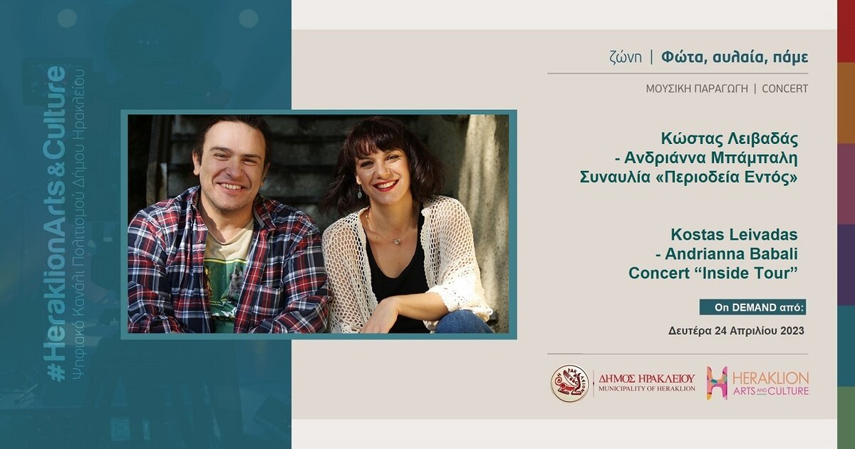 Η συναυλία του Κώστα Λειβαδά και της Ανδριάννας Μπάμπαλη, που παρουσιάστηκε στο Πολύκεντρο του Δήμου Ηρακλείου στο πλαίσιο του 7ου Φεστιβάλ «Τέχνη Καθ’ Οδόν», είναι διαθέσιμη στο κανάλι πολιτισμού του Δήμου Ηρακλείου, Heraklion Arts and Culture, στη Ζώνη θέασης «Φώτα, Αυλαία, Πάμε» https://youtu.be/uLuVdezqVCM