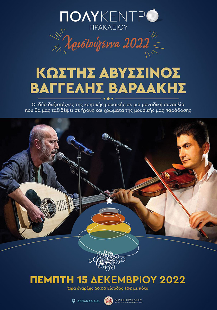 Την Πέμπτη 15 Δεκεμβρίου στις 20:00 το βράδυ στο Πολύκεντρο Ηρακλείου οι χριστουγεννιάτικες εκδηλώσεις συνεχίζονται με τον Βαγγέλη Βαρδάκη και τον Κωστή Αβυσσινό με ήχους και χρώματα της μουσικής παράδοσης!