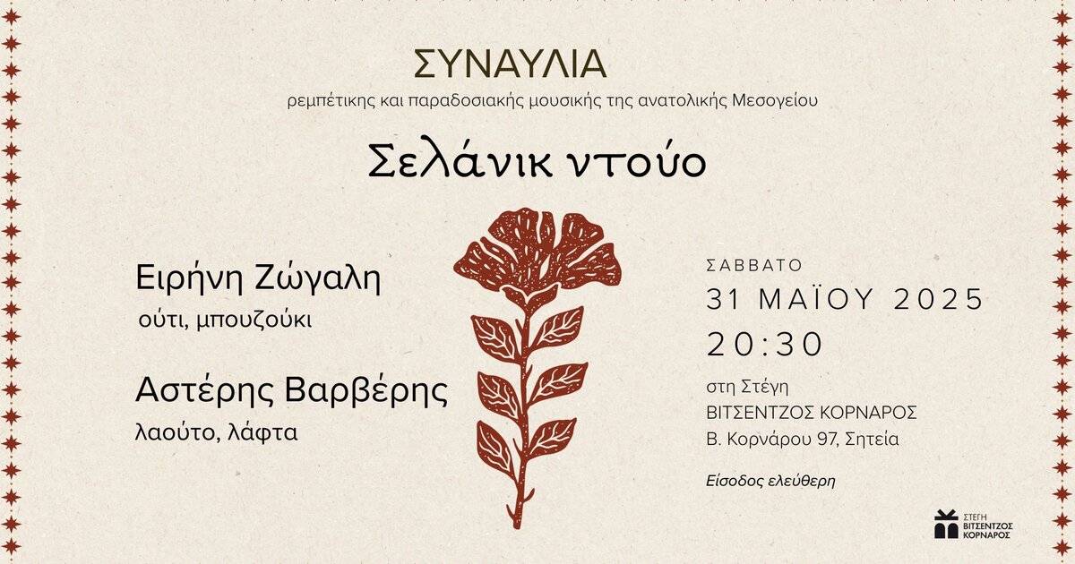 Συναυλία με τίτλο "Σελάνικ ντούο" με ρεμπέτικη και παραδοσιακή μουσική της ανατολικής Μεσογείου με τον Αστέρη Βαρβέρη (λαούτο, λάφτα) και την Ειρήνη Ζώγαλη (ούτι, μπουζούκι) διοργανώνει το Σάββατο 31 Μαΐου 2025 στις 20:30 η Στέγη ΒΙΤΣΕΝΤΖΟΣ ΚΟΡΝΑΡΟΣ στη Σητεία. Η είσοδος για το κοινό είναι ελεύθερη.