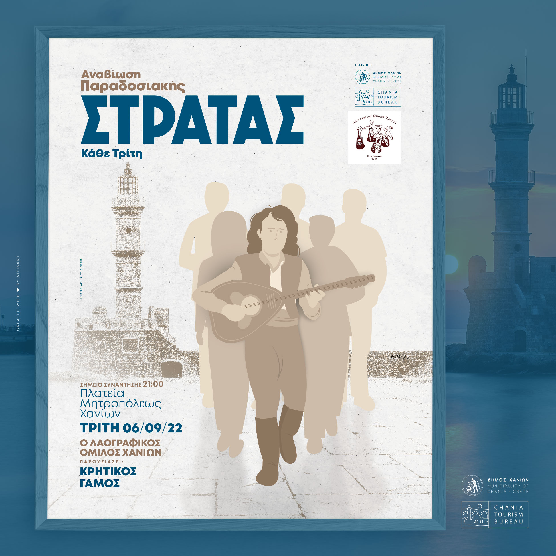 Με μεγάλη επιτυχία και συμμετοχή εκατοντάδων Χανιωτών αλλά και τουριστών πραγματοποιείται κάθε Τρίτη, τα βράδια του καλοκαιριού, η αναβίωση του μουσικοχορευτικού δρώμενου της «Παραδοσιακής Στράτας», από τον Δήμο Χανίων.