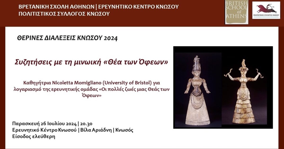 Συνεχίζοντας τη συνεργασία τους το Ερευνητικό Κέντρο Κνωσού/ Βρετανική Σχολή Αθηνών και ο Πολιτιστικός Σύλλογος Κνωσού ανακοινώνουν την πρώτη από τις Θερινές Διαλέξεις Κνωσού 2024!
