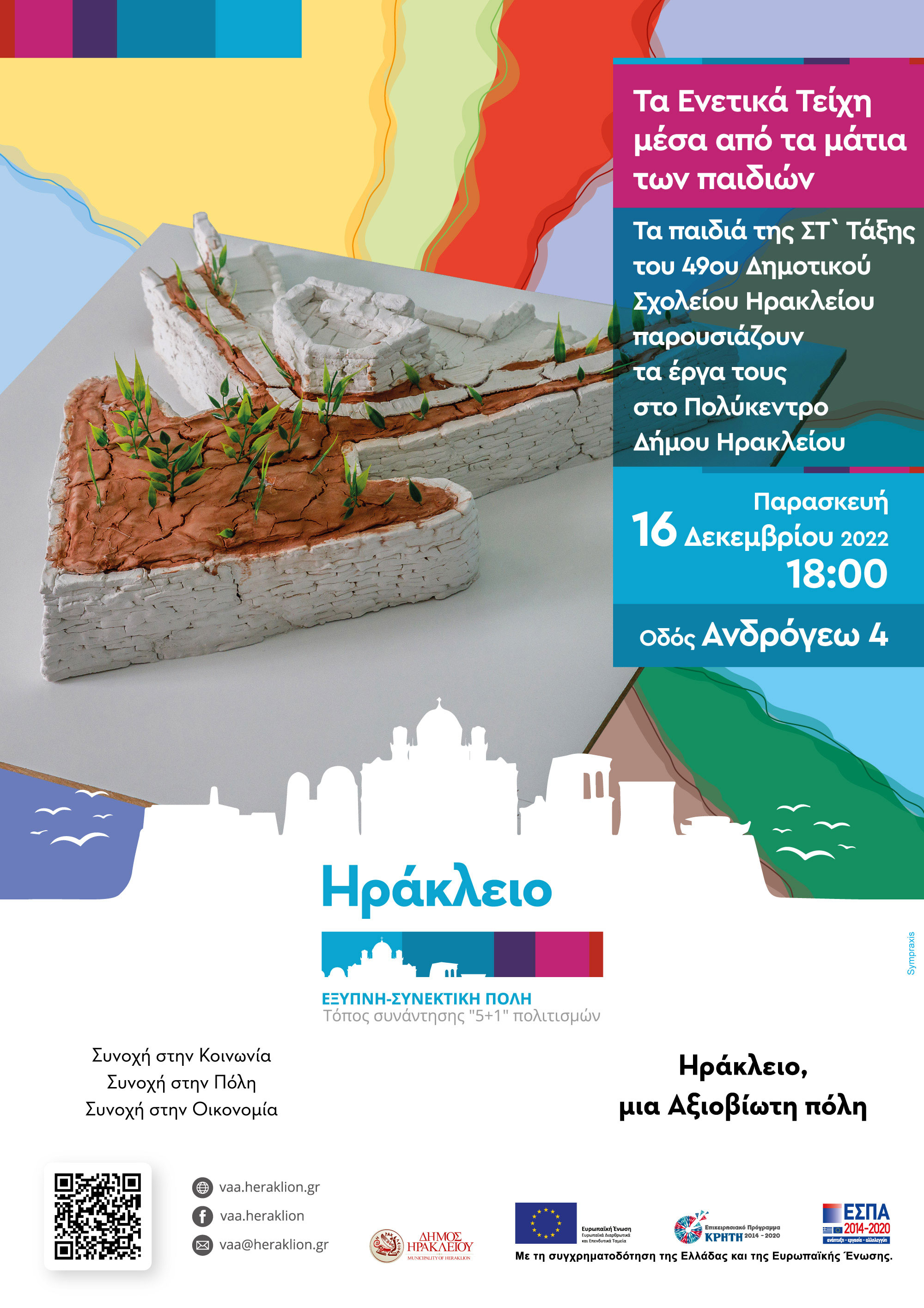Εκδήλωση με θέμα «Τα Ενετικά Τείχη μέσα από τα μάτια των παιδιών» πρόκειται να πραγματοποιηθεί στο Πολύκεντρο Δήμου Ηρακλείου, την Παρασκευή 16 Δεκεμβρίου στις 18.00. Κατά τη διάρκεια της εκδήλωσης, οι μαθητές της ΣΤ` Τάξης του 49ου Δημοτικού Σχολείου Ηρακλείου, θα παρουσιάσουν την εργασία τους για τα Ενετικά Τείχη της πόλης και τα εικαστικά έργα που δημιούργησαν ως αποτέλεσμα αυτής της εκπαιδευτικής ενασχόλησης. Στο πλαίσιο της Στρατηγικής Βιώσιμης Αστικής Ανάπτυξης (ΣΒΑΑ), το σχολείο συμπράττει με τον Δήμο Ηρακλείου, εφαρμόζοντας το πιλοτικό εκπαιδευτικό πρόγραμμα που εντάσσεται στις δράσεις της ΣΒΑΑ.