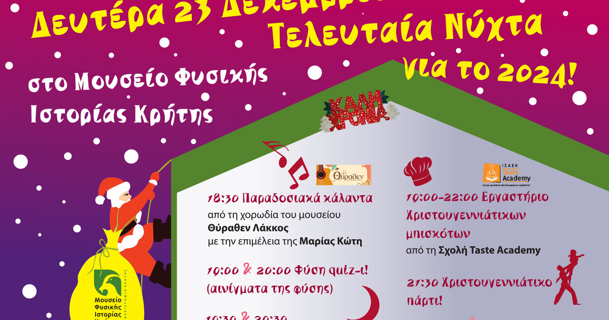 "Είστε έτοιμες και έτοιμοι για την τελευταία νύχτα για το 2024 στο Μουσείο Φυσικής Ιστορίας Κρήτης; Τη Δευτέρα 23 Δεκεμβρίου ανοίγουμε εκτάκτως το απόγευμα στις 18:00 και μέχρι τα μεσάνυχτα γιορτάζουμε παρέα!