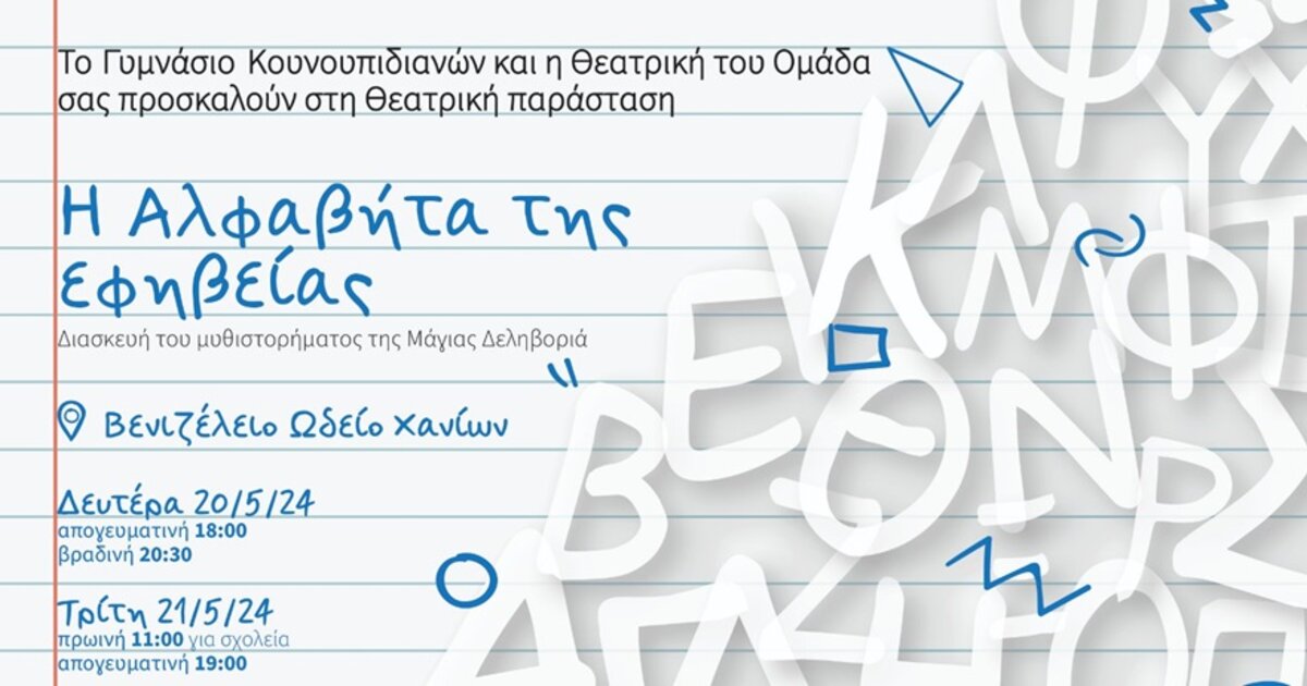 Η θεατρική ομάδα του Γυμνασίου Κουνουπιδιανών παρουσιάζει το έργο «Η αλφαβήτα της εφηβείας» τη Δευτέρα 20 και την Τρίτη 21 Μαΐου στο Βενιζέλειο Ωδείο Χανίων, μια παράσταση βασισμένη στο βραβευμένο ομώνυμο μυθιστόρημα της Μάγιας Δεληβοριά.