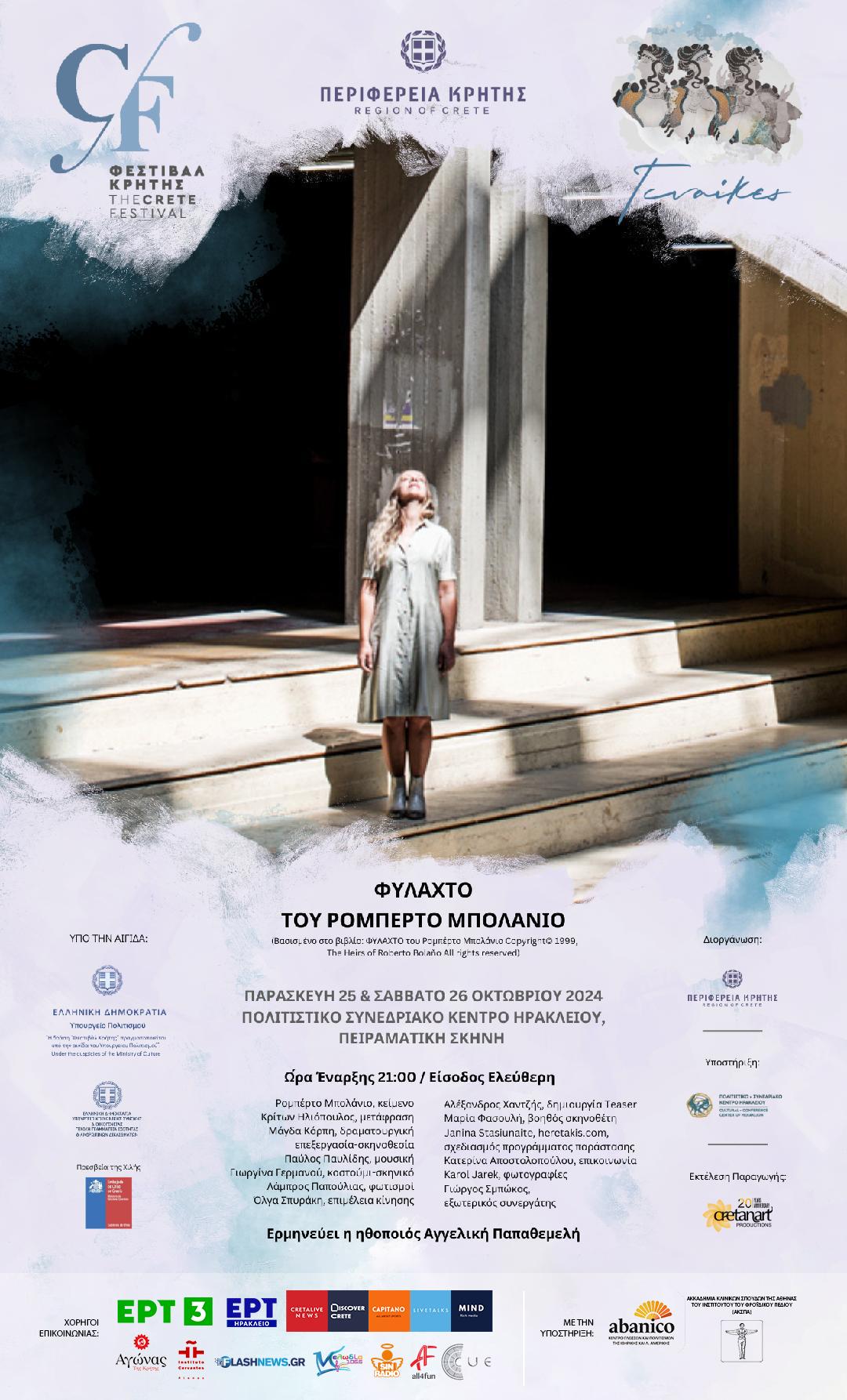 Στο πλαίσιο της παράλληλης δράσης του «Φεστιβάλ Κρήτης» 2024 «ΓΥΝΑΙΚΕΣ», πρόκειται να παρουσιαστεί την Παρασκευή 25 Οκτωβρίου και το Σάββατο 26 Οκτωβρίου 2024 η θεατρική παράσταση Φυλαχτό στην Πειραματική Σκηνή του Πολιτιστικού Συνεδριακού Κέντρου Ηρακλείου Κρήτης, στις 9:00μ.μ., βασισμένη στο βιβλίο ΦΥΛΑΧΤΟ του Ρομπέρτο Μπολάνιο.