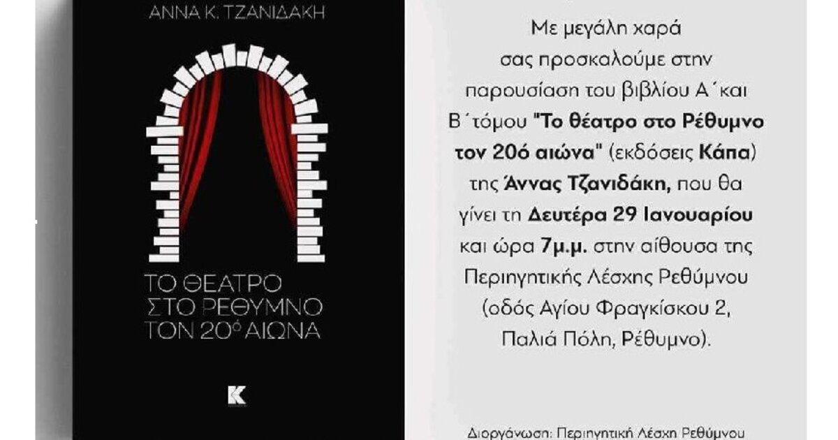 Ένα νέο δίτομο βιβλίο αναμένεται να παρουσιαστεί την επόμενη Δευτέρα 29 Ιανουαρίου και ώρα 19:00 στην αίθουσα της Περιηγητικής Λέσχης Ρεθύμνου. Πρόκειται για το αποτέλεσμα μιας πολύχρονης έρευνας της δρ. Θεατρολογίας και Ρεθεμνιώτισσας Άννας Τζανιδάκη, η οποία καταγράφει σε 1000 σελίδες την θεατρική δραστηριότητα που αναπτύχθηκε στην πόλη μας από το 1900 έως το 2000.