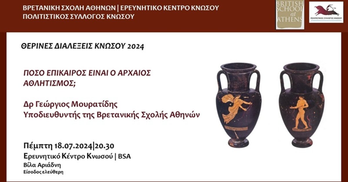 Ομιλία με θέμα "Πόσο επίκαιρος είναι ο αρχαίος αθλητισμός" διοργανώνεται την Πέμπτη 18 Ιουλίου 2024, στις 20:30,στο Ερευνητικό Κέντρο Κνωσού, Βίλλα Αριάδνη. Ομιλητής θα είναι ο Δρ Γεώργιος Μουρατίδης, Υποδιευθυντής της Βρετανικής Σχολής Αθηνών.