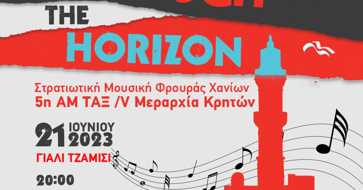 Η Στρατιωτική Μουσική Φρουράς Χανίων - 5η ΑΜ ΤΑΞ /V Μεραρχία Κρητών συμμετέχει στο 1ο Φεστιβάλ Μουσικής: «THROUGH THE HORIZON» που έχει αρχίσει ήδη να διεξάγεται με μεγάλη επιτυχία από τις 18 Ιουνίου και θα ολοκληρωθεί στις 21 Ιουνίου. Συγκεκριμένα το βράδυ της 21ης Ιουνίου 2023 στις 20.00 θα πραγματοποιηθεί συναυλία με έντεχνη μουσική, στην Πλατεία πίσω από το Τέμενος του Κιουτσούκ Χασάν (Γιαλί Τζαμισί). Συμμετέχουν: