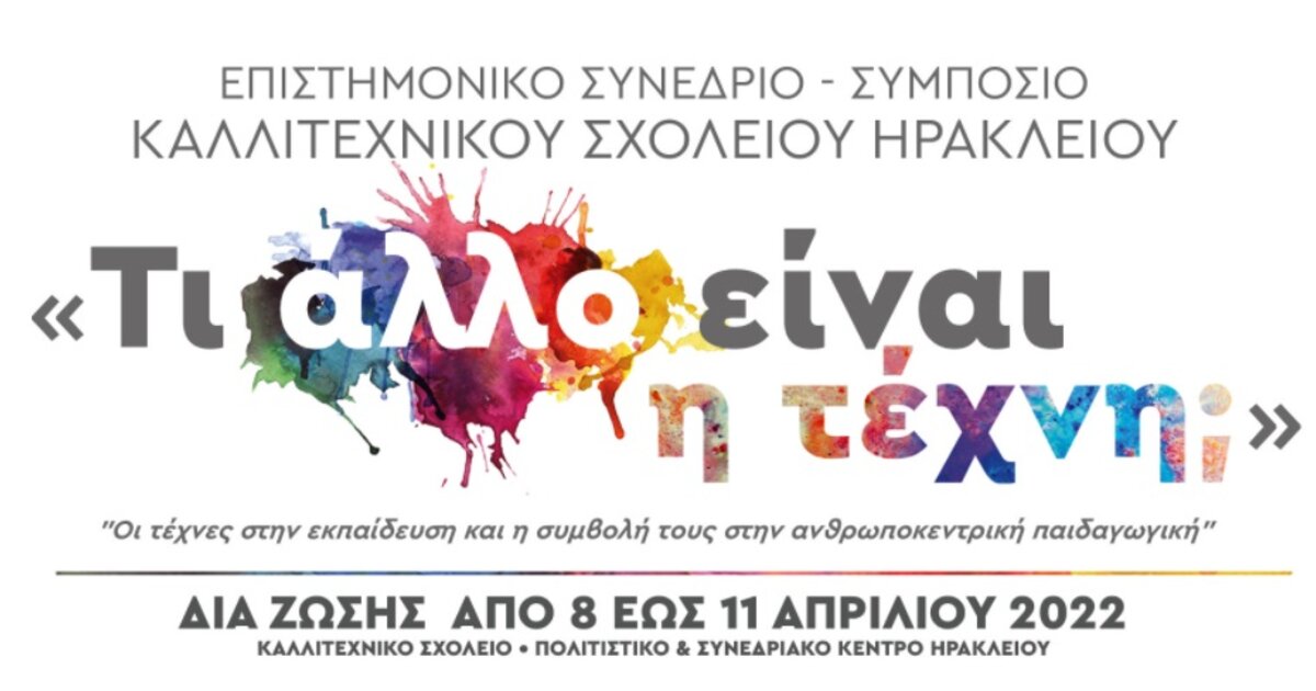 Η Περιφέρεια Κρήτης, η Περιφερειακή Διεύθυνση Εκπαίδευσης Κρήτης, το Καλλιτεχνικό Σχολείο Ηρακλείου και ο «Σύλλογος Φίλων Καλλιτεχνικού Σχολείου Ηρακλείου» συνδιοργανώνουν με τον Δήμο Χερσονήσου και τη στήριξη της πολυμετοχικής Δημοτικής Α.Ε Πολιτισμού Τουρισμού Ανάπτυξης Ηρακλείου (ΔΕΠΑΝΑΛ), Επιστημονικό Συνέδριο – Συμπόσιο με θέμα: «Τι άλλο είναι η τέχνη; Οι τέχνες στην εκπαίδευση και η συμβολή τους στην ανθρωποκεντρική παιδαγωγική».