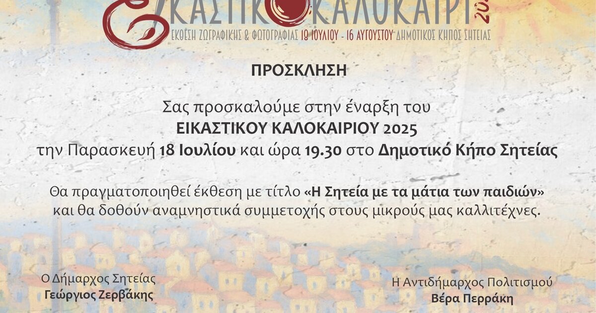 Στον Δημοτικό Κήπο Σητείας θα πραγματοποιηθεί η έναρξη του Εικαστικού Καλοκαιριού 2025, την Παρασκευή 18 Ιουλίου στις 19:30.