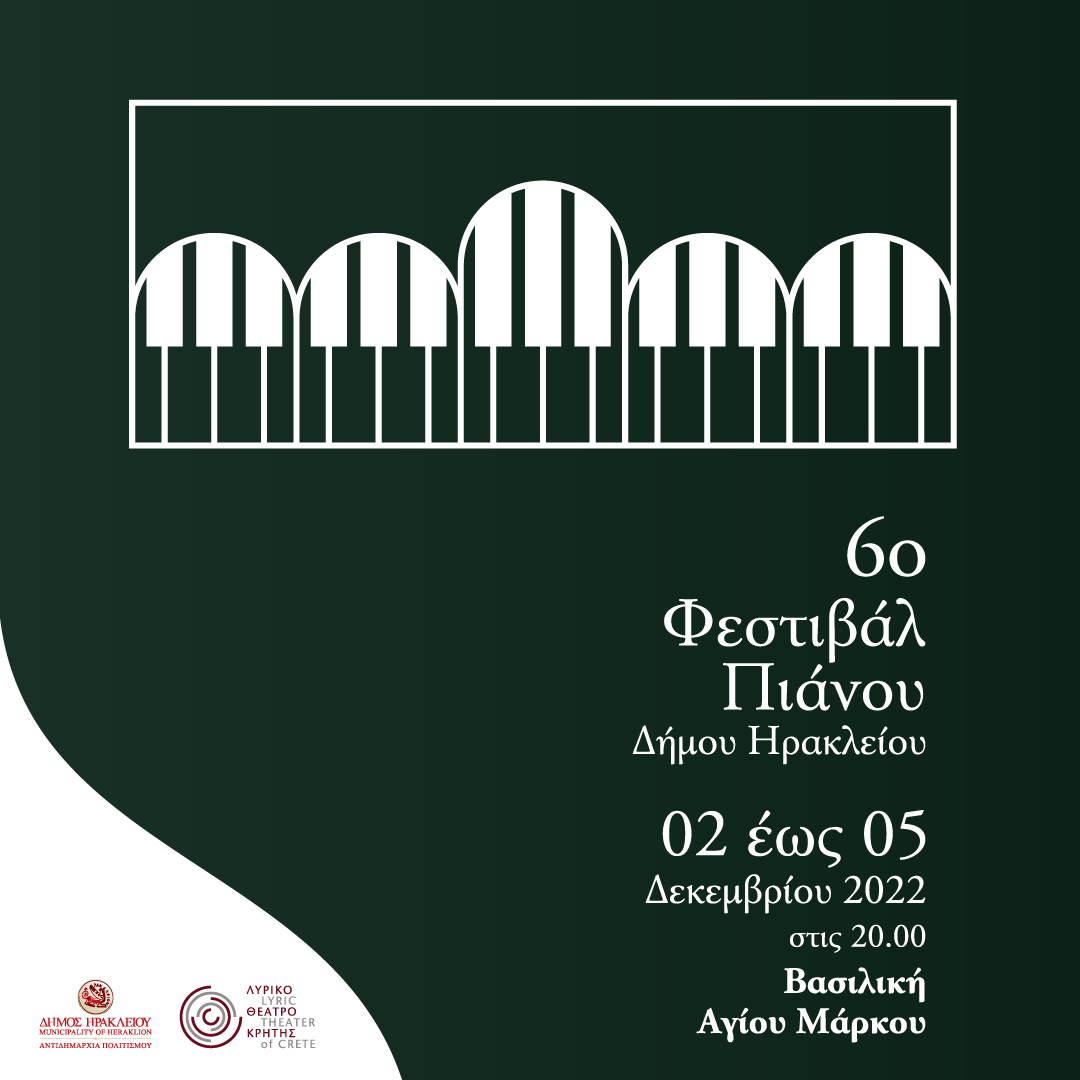 Ο Δήμος Ηρακλείου και το Λυρικό Θέατρο Κρήτης παρουσιάζουν το 6ο Φεστιβάλ Πιάνου του Δήμου Ηρακλείου. Το Φεστιβάλ θα πραγματοποιηθεί από την Παρασκευή 2 έως και την Δευτέρα 5 Δεκεμβρίου 2022 στη Βασιλική του Αγίου Μάρκου με τη συμμετοχή καλλιτεχνών από την Ευρώπη, την Ασία , την Αμερική αλλά και την Κρήτη.