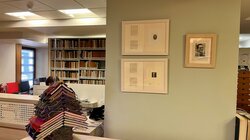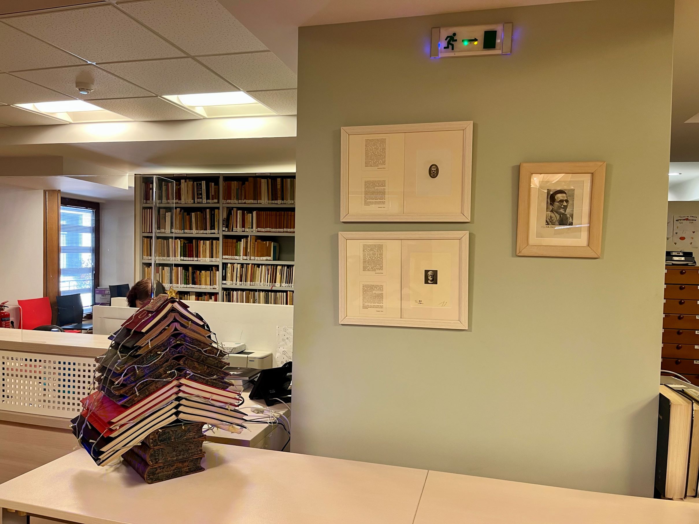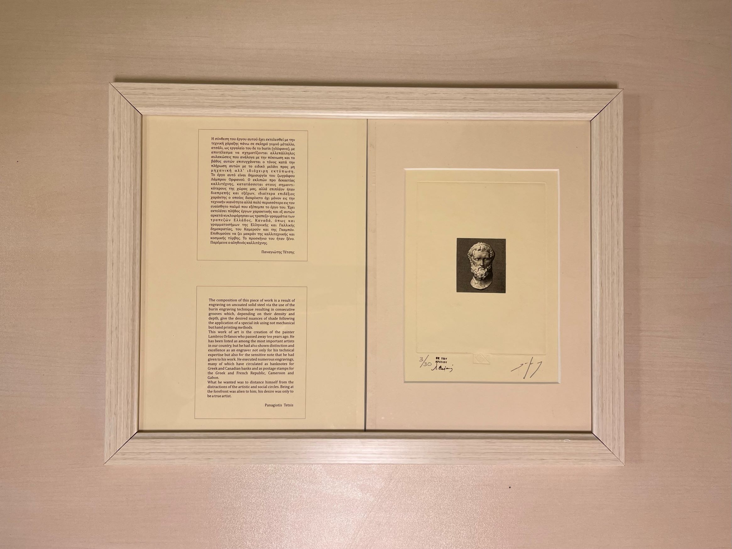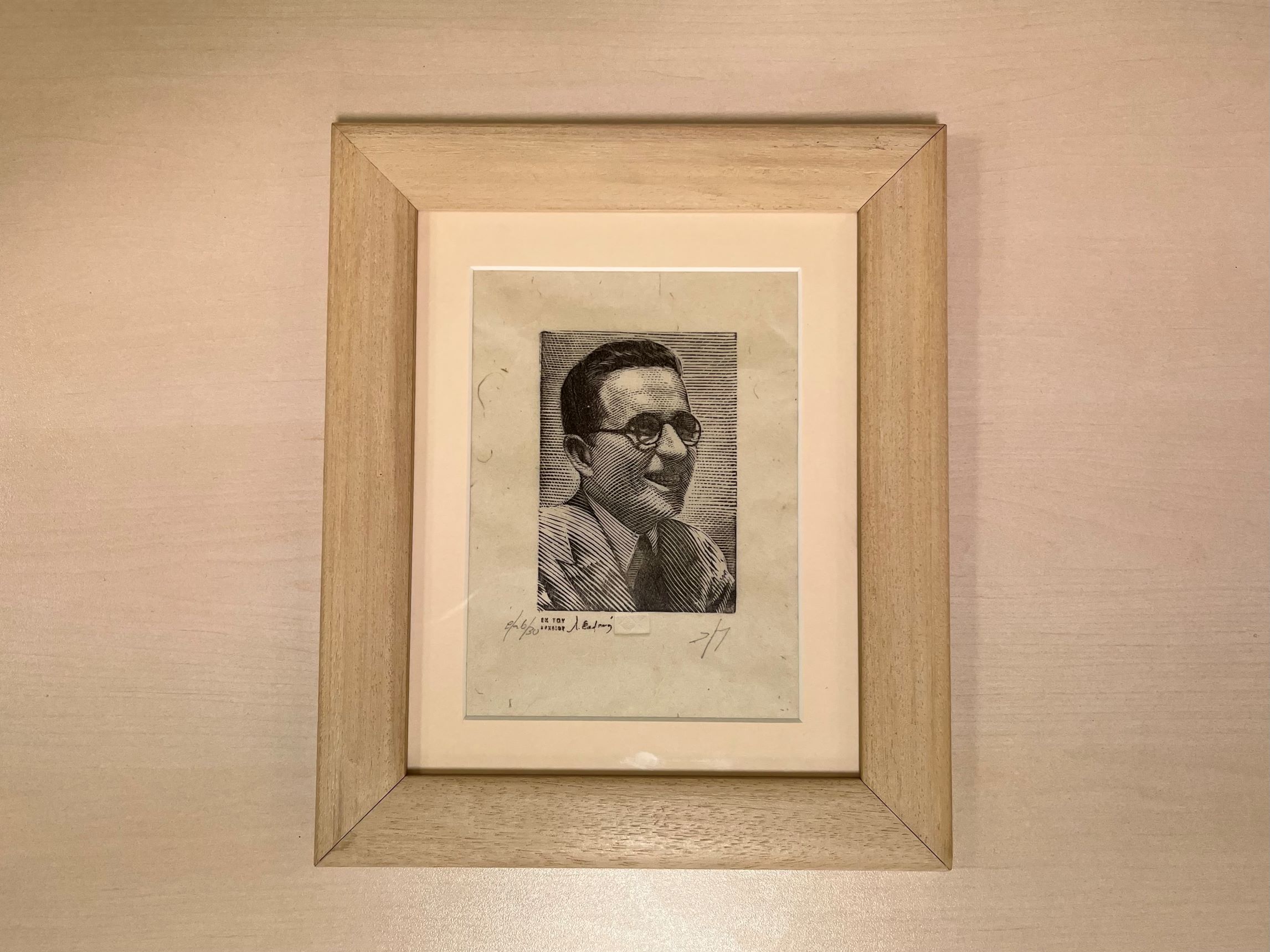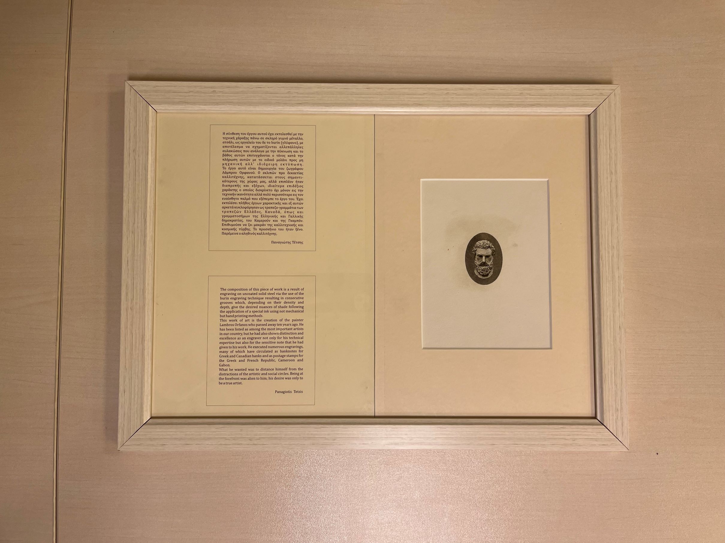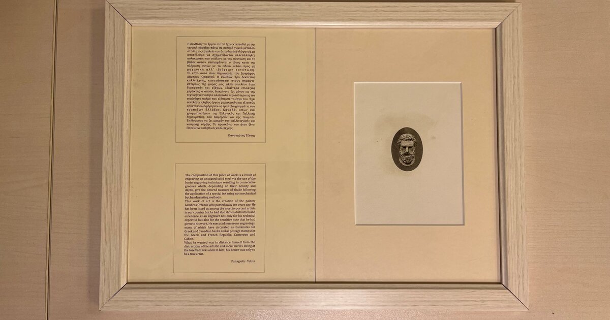 Πρόκειται για μια χαλκογραφία εν αναμονή με την κεφαλή του Αριστοτέλη, μια χαλκογραφία εν αναμονή με την κεφαλή του Αισχύλου και μια ξυλογραφία σε όρθιο ξύλο με την κεφαλή του Ιωάννη Συκουτρή. Τα έργα τα οποία δημιουργήθηκαν προκειμένου να χρησιμοποιηθούν σε χαρτονομίσματα και βρίσκονται σε κατάσταση αναμονής, κοσμούν ήδη το χώρο του Αναγνωστηρίου της Βιβλιοθήκης στο Τμήμα Εσωτερικού Δανεισμού.