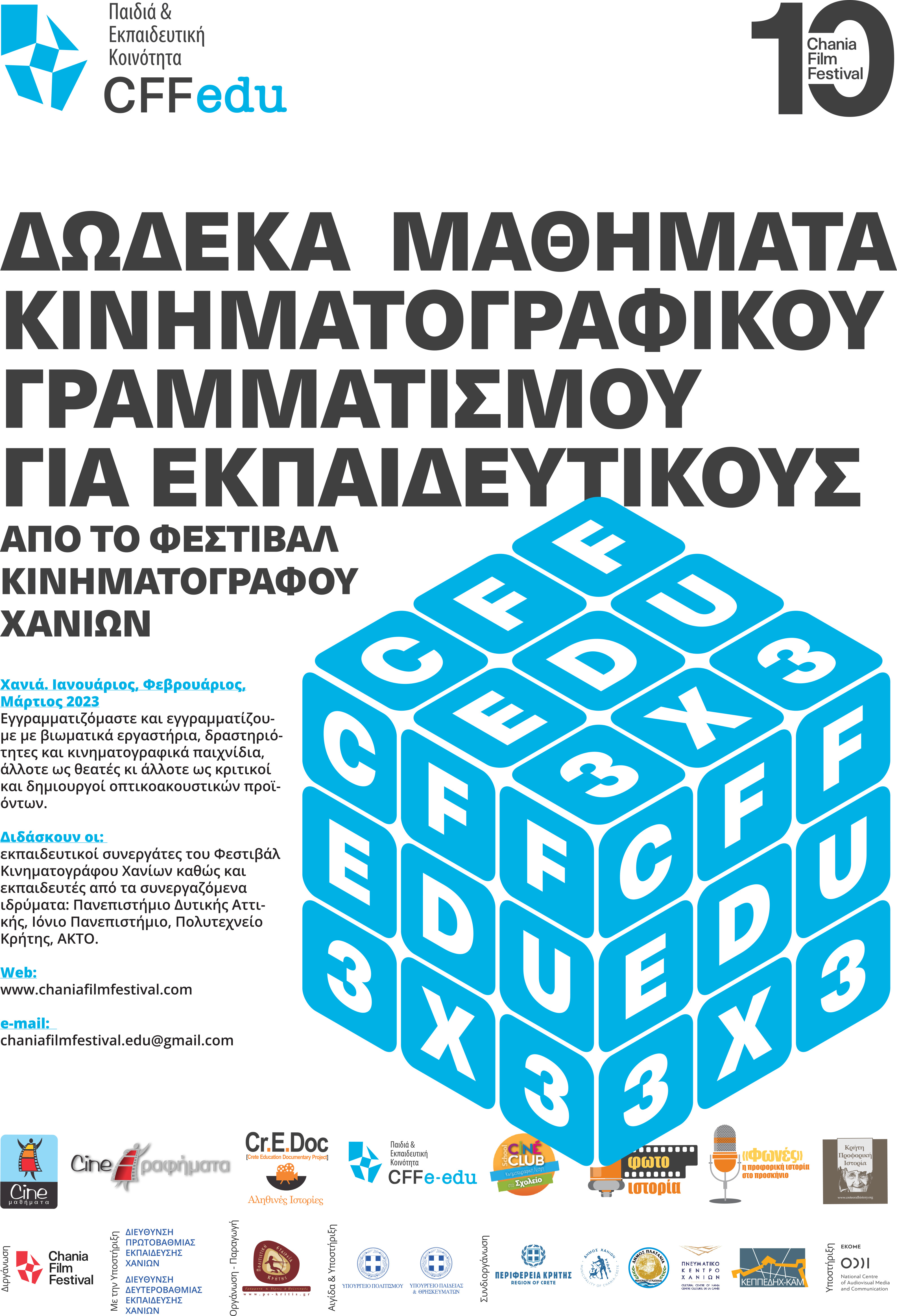 Ξεκινάει σήμερα στις 5 το απόγευμα στο Πνευματικό Κέντρο Χανίων το πρώτο τριήμερο από ένα κύκλο Δώδεκα Μαθημάτων Κινηματογραφικού Γραμματισμού για Εκπαιδευτικούς που διοργανώνει το Φεστιβάλ Κινηματογράφου Χανίων.