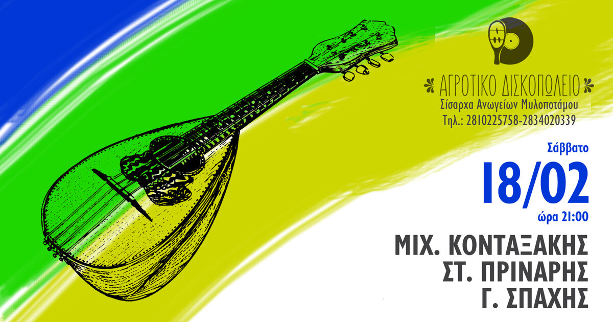 Ο Μιχάλης Κονταξάκης προσκαλεί δυο σημαντικούς παίχτες του κρητικού μαντολίνου τον Γιάννη Σπαχή και τον Στέλιο Πρινάρη σε μια σύμπραξη που παρουσιάζεται πρώτη φορά μπροστά στο κοινό, Σάββατο 18 Φεβρουαρίου, στις 21.00 στο Αγροτικό Δισκοπωλείο. Σημείο αναφοράς το μαντολίνο και η μουσική της Κρήτης.