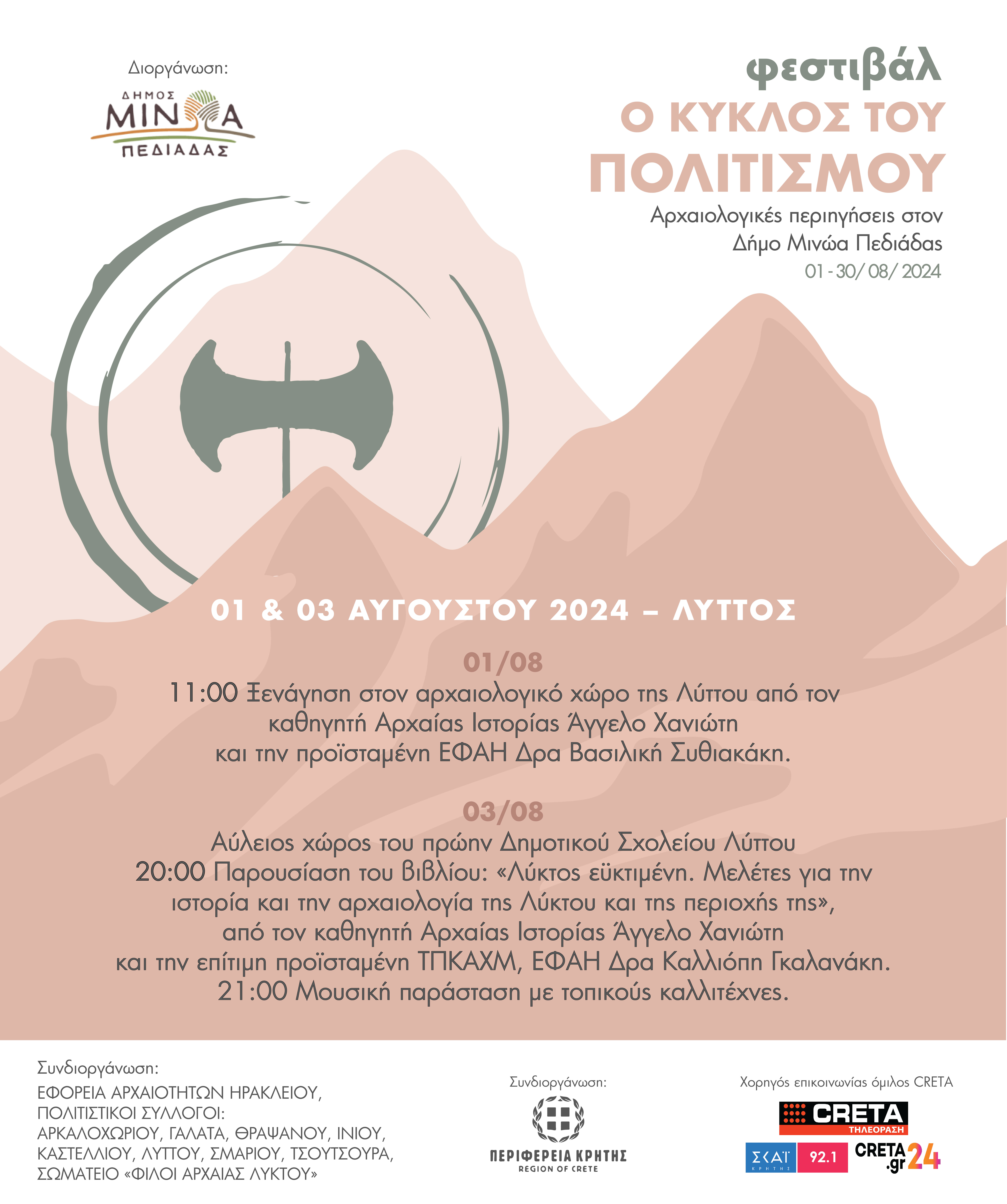 21:00 – Μουσική παράσταση με τοπικούς καλλιτέχνες. Οργάνωση: Δήμος Μινώα Πεδιάδας Συνδιοργάνωση: Εφορεία Αρχαιοτήτων Ηρακλείου, Περιφέρεια Κρήτης, Πολιτιστικός Σύλλογος Λύττου, Σωματείο «Φίλοι Αρχαίας Λύκτου»