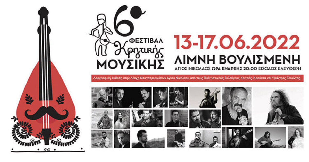 6ο ΦΕΣΤΙΒΑΛ ΚΡΗΤΙΚΗΣ ΜΟΥΣΙΚΗΣ Λίμνη Αγίου Νικολάου (Βουλισμένη) Δευτέρα 13 Ιουνίου έως Παρασκευή 17 Ιουνίου 2022 από τις 20:00 έως τις 24:00.