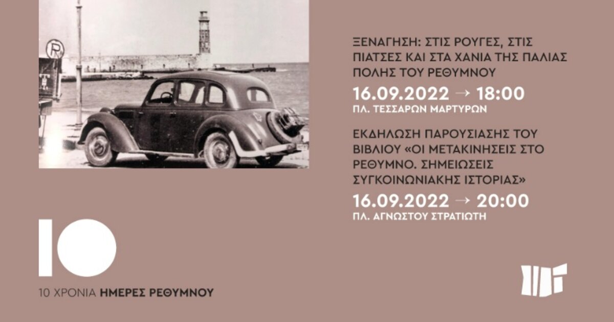 Με την ευκαιρία της κυκλοφορίας και παρουσίασης του βιβλίου τους «Οι μετακινήσεις στο Ρέθυμνο. Σημειώσεις συγκοινωνιακής ιστορίας», οι συγγραφείς Θωμάς Κρεβετζάκης και Χάρης Στρατιδάκης οργανώνουν στο πλαίσιο των «Ημερών Ρεθύμνου 2022» σχετικό ιστορικό περίπατο στην παλιά πόλη.