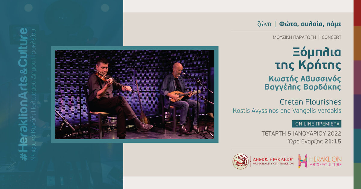 Οι δυο καταξιωμένοι, λαϊκοί οργανοπαίχτες ορμώμενοι από τις ρίζες της παραδοσιακής κρητικής μουσικής και κουβαλώντας αναμνήσεις, βιώματα, ήχους και χρώματα από τις μουσικές της παρέας και των γλεντιών στήνουν μια μουσική παράσταση αποδίδοντας με το δικό τους ξεχωριστό τρόπο αγαπημένους σκοπούς της Κρήτης.
