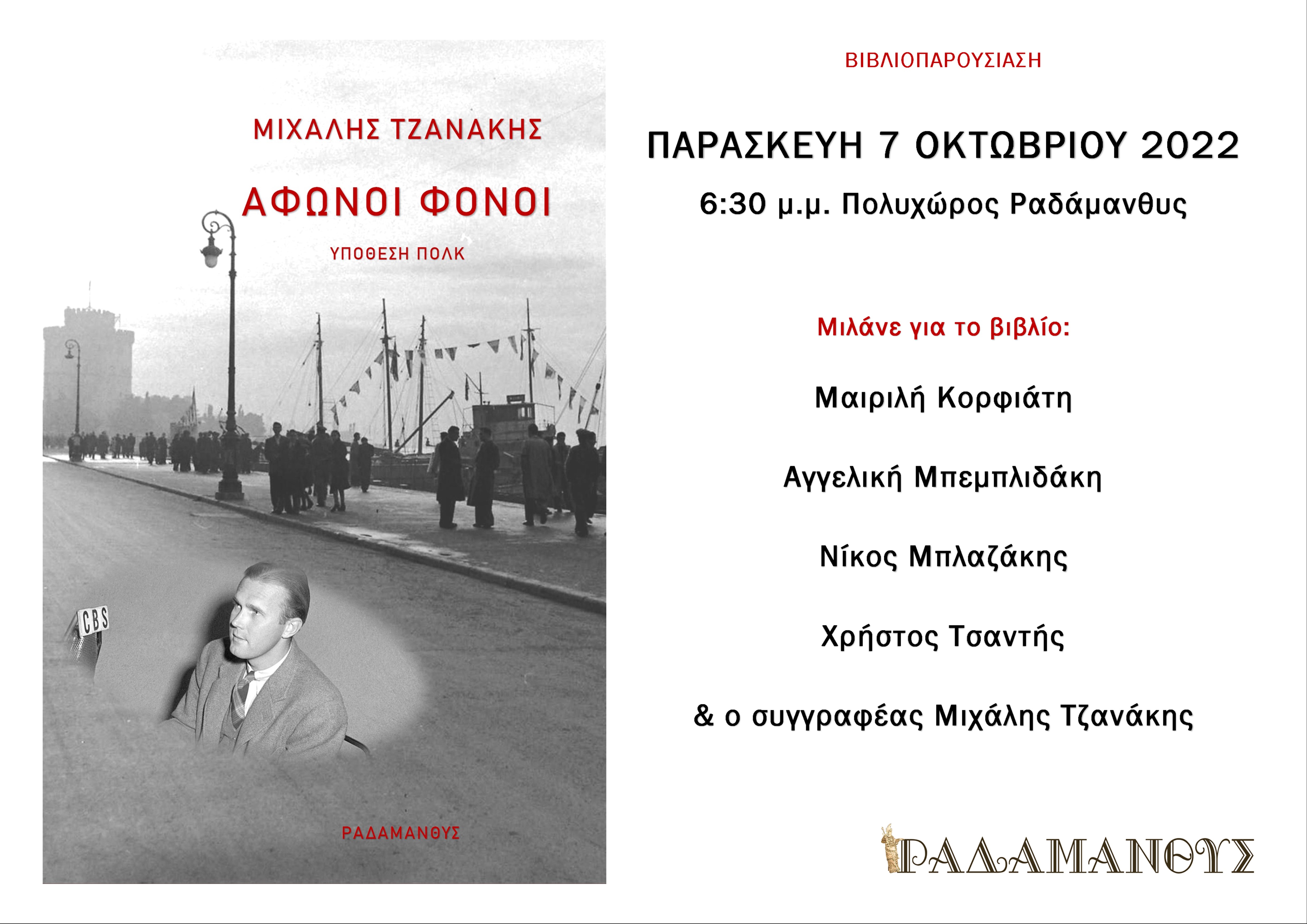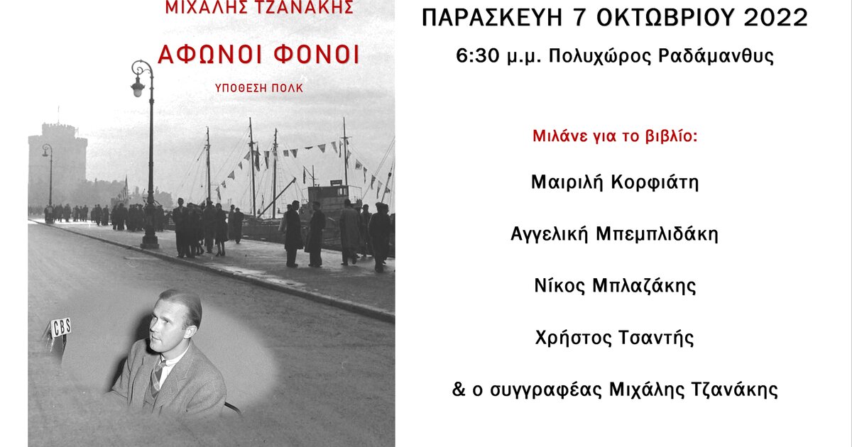 Οι Εκδόσεις Ραδάμανθυς παρουσιάζουν το ιστορικό μυθιστόρημα «Άφωνοι Φόνοι – Υπόθεση Πολκ» του Μιχάλη Τζανάκη, την Παρασκευή 7 Οκτωβρίου 2022, στις 6:30 το απόγευμα, στον Πολυχώρο Ραδάμανθυς (Ξέπαπα 7) στα Χανιά.