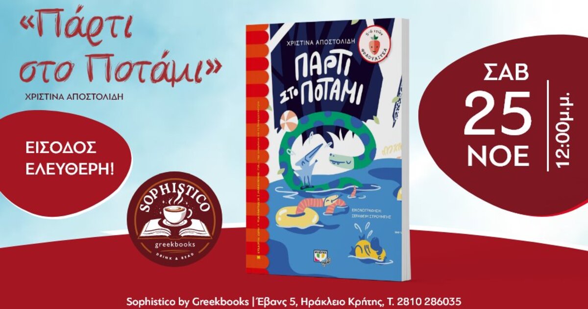 Η Χριστίνα Αποστολίδη παρουσιάζει το «Πάρτι στο Ποτάμι» στα Παραμύθια του Σαββάτου στο βιβλιοπωλείο & καφέ Sophistico By Greekbooks στην οδό Έβανς 5, στο Ηράκλειο