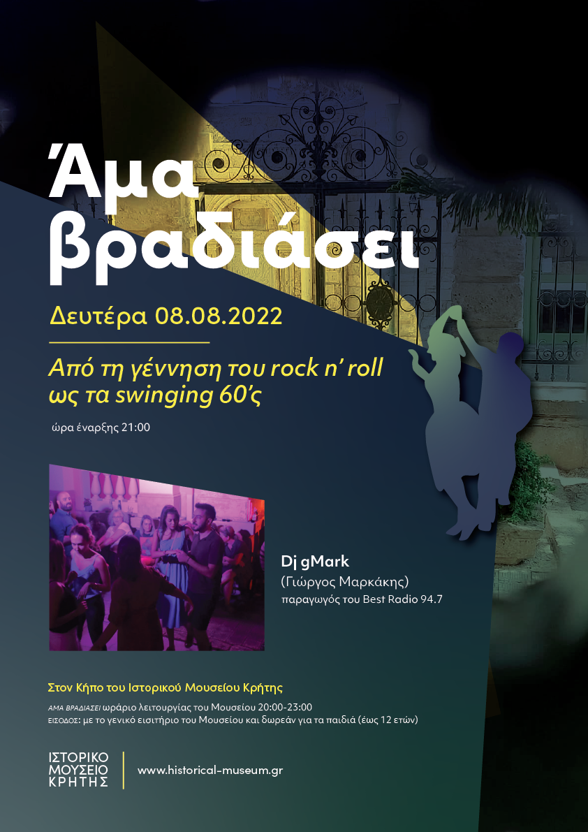 Με χορό και μουσική από τη γέννηση του rock n’ roll ως τα swinging 60’ς ανανεώνουμε τις συναντήσεις μας τη Δευτέρα 8.8.22, στις 9.00 μ.μ., στον Κήπο του Ιστορικού Μουσείου Κρήτης.