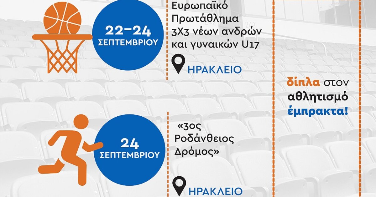 Σημαντικές διοργανώσεις πραγματοποιούνται τις προσεχείς ημέρες στην Κρήτη, με την στήριξη της Περιφέρειας Κρήτης. Από την Παρασκευή 22 έως και την Κυριακή 24 Σεπτεμβρίου θα πραγματοποιηθεί στο Ηράκλειο το Ευρωπαϊκό Πρωτάθλημα 3Χ3 νέων ανδρών και γυναικών U17. Επίσης την Κυριακή 24 Σεπτεμβρίου θα πραγματοποιηθεί στο Ηράκλειο ο «3ος Ροδάνθειος Δρόμος».