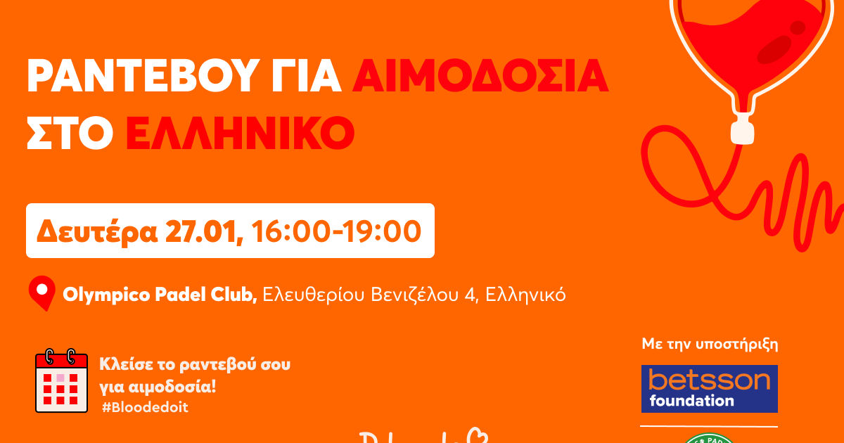 Tο Betsson Foundation σε συνεργασία με το Βloode, με στόχο να ανταποκριθούν στις ανάγκες για αίμα, διοργανώνουν από κοινού τη δεύτερη εθελοντική αιμοδοσία στην Αθήνα και σε προσκαλούν να συμμετέχεις κι εσύ τη Δευτέρα 27 Ιανουαρίου μεταξύ 16:00-19:00 στην αιμοδοσία που θα διεξαχθεί στο Olympico Padel Club, Ελ. Βενιζέλου 4 στο Ελληνικό (πλησίον σταθμό μετρό). Η αιμοδοσία γίνεται σε συνεργασία με το Νοσοκομείο Ευαγγελισμός.