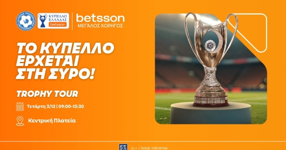 Μετά τις δύο πρώτες εντυπωσιακές στάσεις σε Λάρισα και Αγρίνιο, το Trophy Tour του Κυπέλλου Ελλάδας Betsson συνεχίζει το ταξίδι του και φτάνει στο κέντρο του Αιγαίου, με επόμενο προορισμό τη Σύρο.